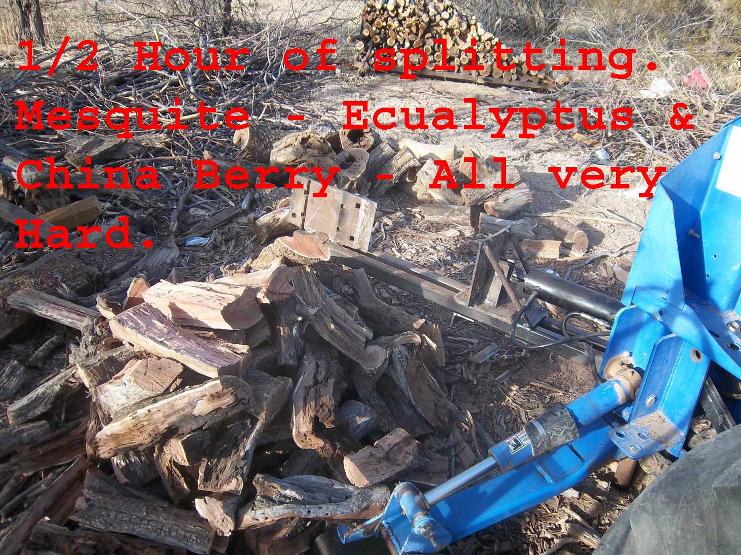 Finished is not the right way to describe the splitter. But it is up and working and has split about ス Cord of wood. Not wimpy straight grain pine & such. Hard and nasty eucalyptus, mesquite & China Berry, crouches, knots & stumps. Largest diameter so far is just over 14", twisted grain eucalyptus and rock hard China Berry. Some stumps were a little larger with a lot of cross grain in them.