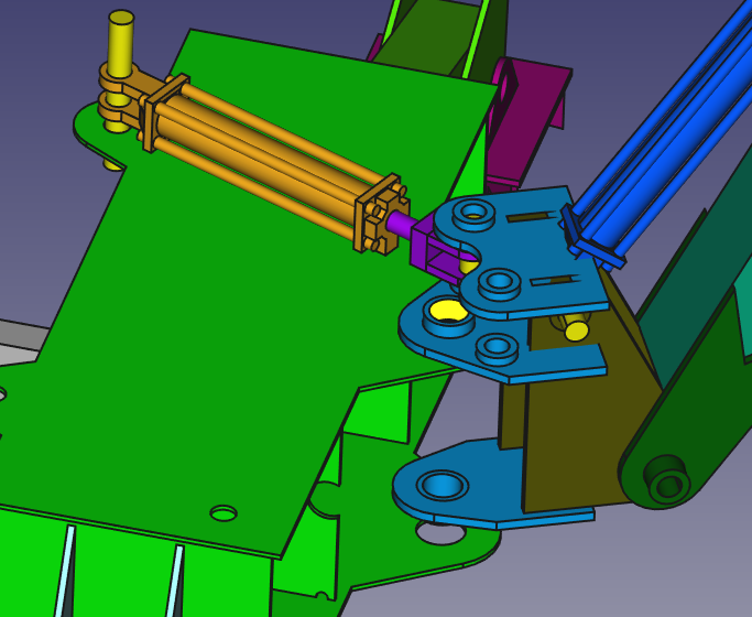I am wondering if I could avoid the huge unique king pin. As I am designing that part of the backhoe, it looks like I could use 2 pins. One on top and one on bottom (between the green and the light blue parts).