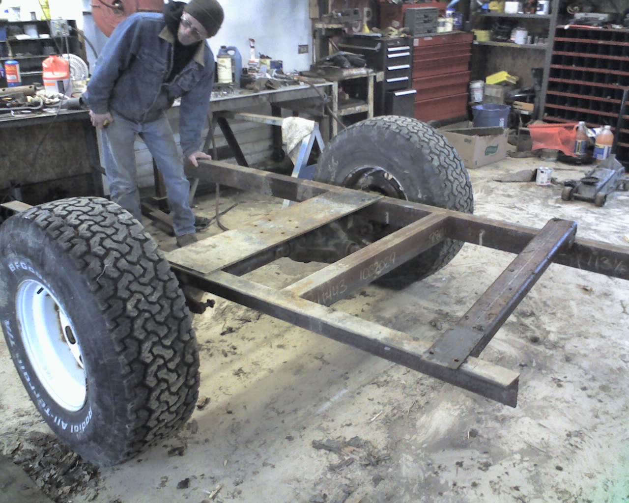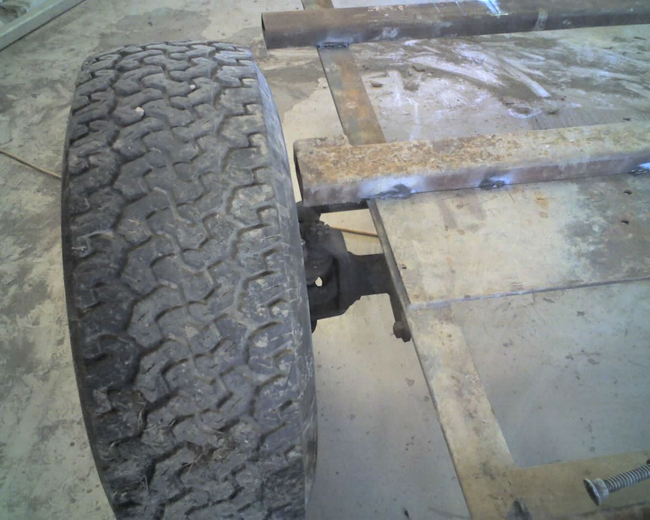 The first pic shows the frame tacked to the axle. The frame rails are 3" x 5" x 3/8" angle. it already had the one cross peice and the flat plate on it. It was a skid that a robot was delivered on where I used to work. We saved it for just this purpose