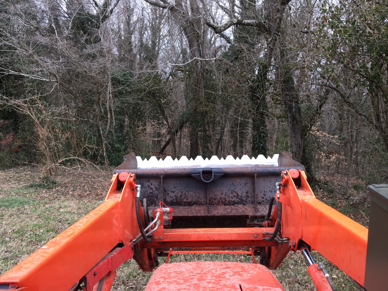 I just fabricated a bracket to fit front chassis cross member to accept a shackle... I have decided it's not really a good idea to use bucket for pulling even with the chain grabs.... Granted I will have to keep bucket up a bit bit its still below sight line over hood....Will still use bucket for odd lifts though, like the 350 pound granite pebble that refuses to move without some brute force... Pictures maybe later if rain stops...