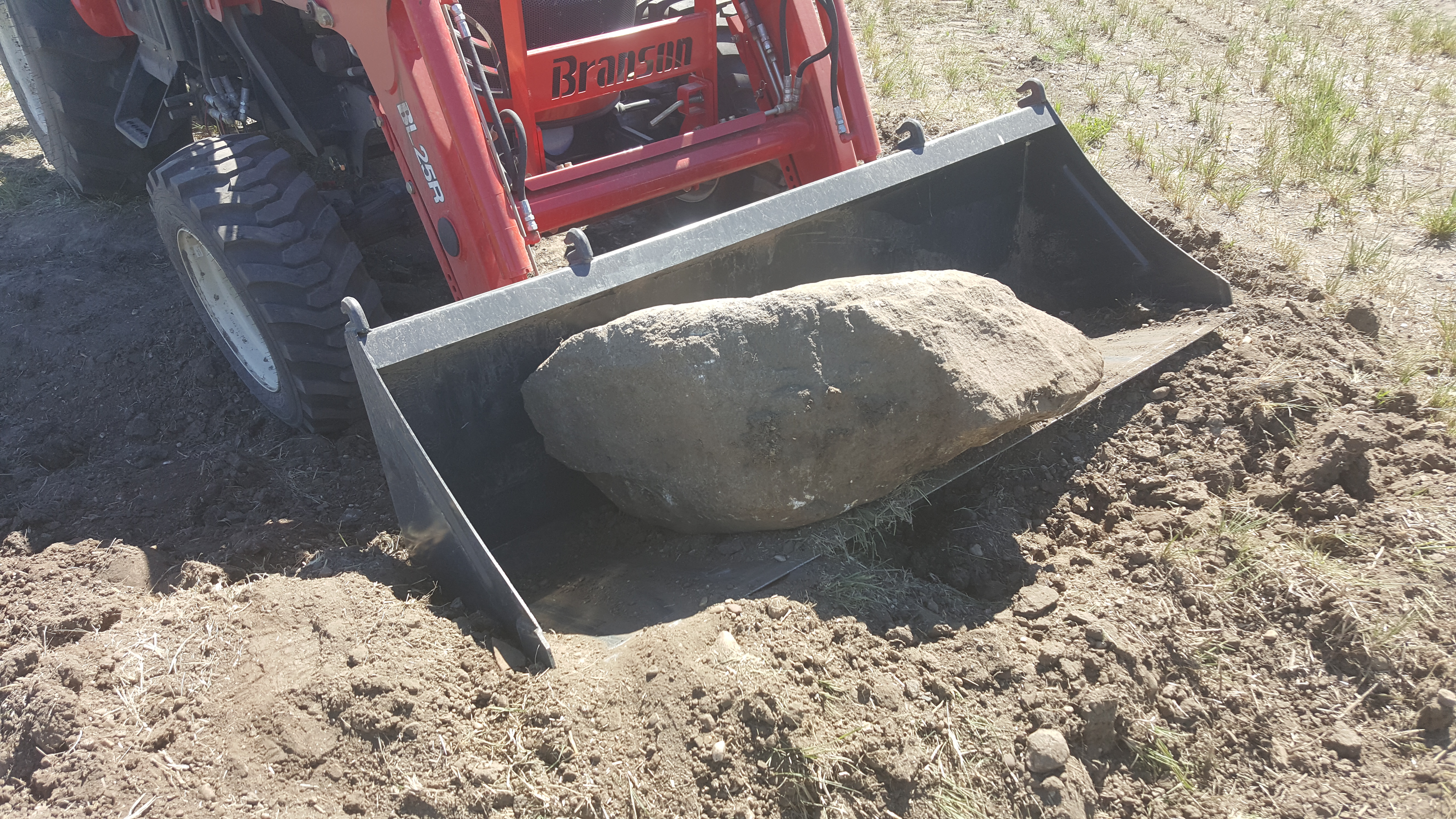 Had a rock like that, that would not go into or stay in bucket.... Old snow tire chain used to form a "basket" [net] and linked to hooks kept it in FEL bucket...