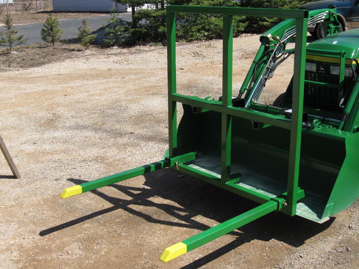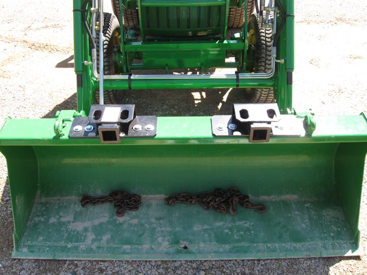 As this quote says and as others here have said, do not put the hooks on the outer edges of the bucket. I've posted pictures before of where I've relocated hooks for people after they've either nearly turned their tractor over or after they've bent their bucket and loader arms from having hooks on the outer edges of the bucket. In line, or as close as possible, with the loader arms is correct. A center hook and/or hitch receiver in the middle is also helpful if properly installed.
