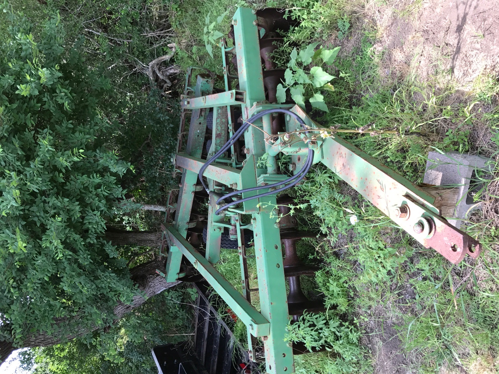 Industrias America brand, it appears to be built off of the John Deere MX 425 offset disc , the reason I went with it was the fact that I was able to purchase it for less than $3k and I couldn't even get a 7.5' three point hitch model for anywhere close to that price. Google Industrias America and I know there is a dealer in Oklahoma that handles them, it is made in Mexico but I think you will be quite surprised at how well they are built, I wanted an American made harrow but I could not justify paying over 10k for one.