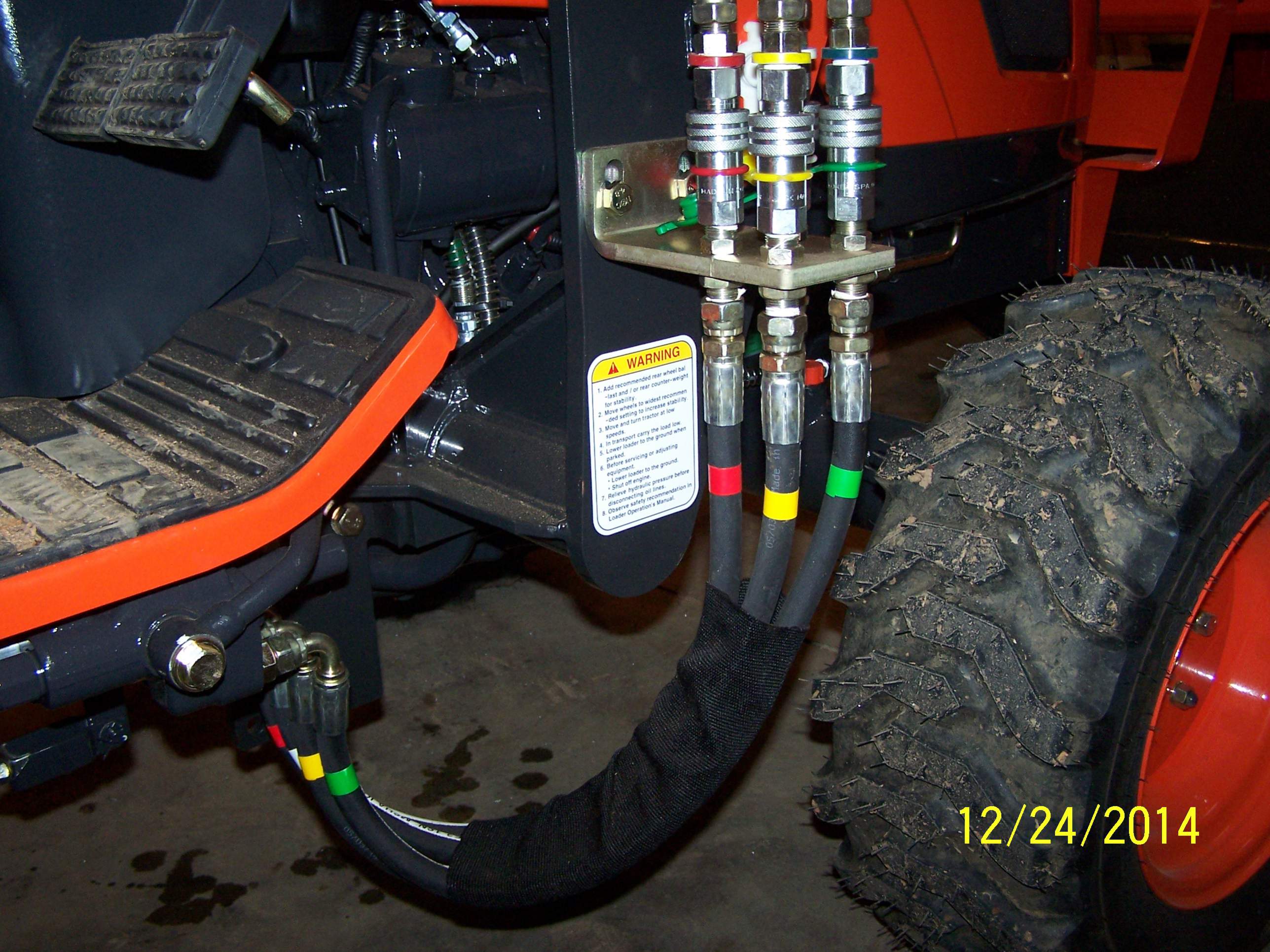 The one thing I didn't like about my Kioti CK2510H was the hoses down below the quick connects they could be damaged.Check out this Video at 1.47min.Maybe this dealer changed the hoses.I am going to look in to this! https://www.youtube.com/watch?v=5dChnR__DT4.Avyone know what size fittings are used on a Kioti tractor? I will add a pic of my current setup soon.