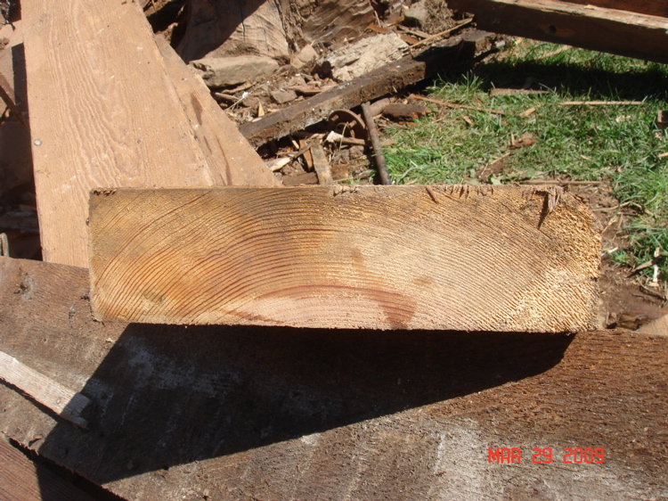 We plan to have the metal detectors in to look here and at the old house site across the creek. I also will dig in the area under the house since the area is very rich in Indian artifacts based on its location on a big loop of Cripple Creek. The wood was very tight grained as evidenced by the attached picture. I have also included a picture of the top of the rafters that were pegged together and as most of the joints were, marked with Roman Numerals. It was a lot of work to tear down, I can't imagine the amount of work to build since they had to make all of those joints. I gave my neighbor took the stair material so he could build a small cabinet for the former owners in his wood shop, the stuff he has planed down so far looks really nice.