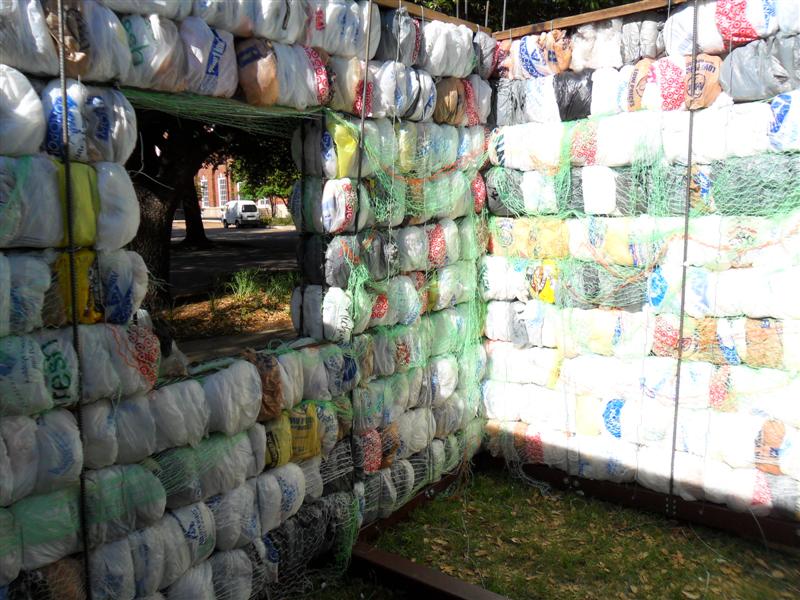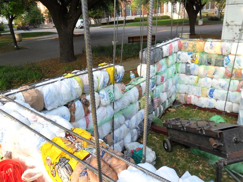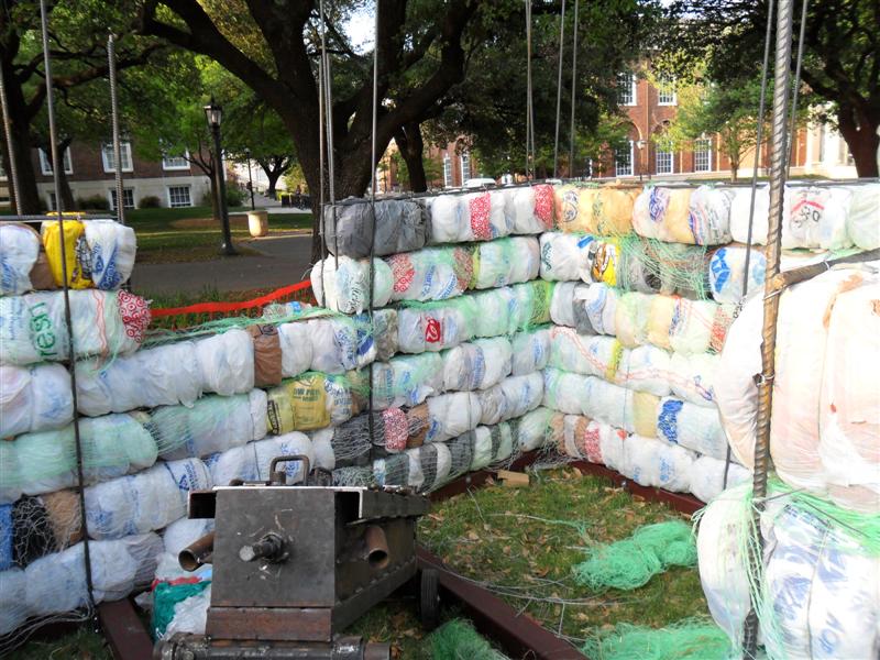Straw bale house made out of recycled plastic.....from what I've read, the thorny issue for straw bale construction is the uneven settling of the roof because of the varying density of the straw bales. If plastic bales have a more consistent density, then maybe not so much a problem. Some of the straw bale houses have been framed enough to support the roof, and the bales just used as in-fill for the walls. I've read that a man named Pliny Fisk used a metal truss and metal roof in combination with straw bales for a model farm developed for the Texas Dept. of Agriculture.