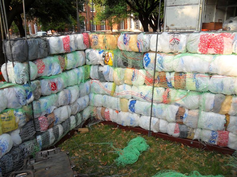 Some interesting points for those interested. There is enough foam and film plastics used to build this model home to fill a large frontloader garbage truck. We're using foam and film plastics here because everything else is picked up with curbside recycling. But all plastics and be used to make blocks.
