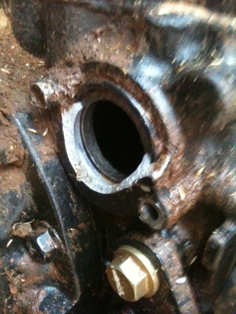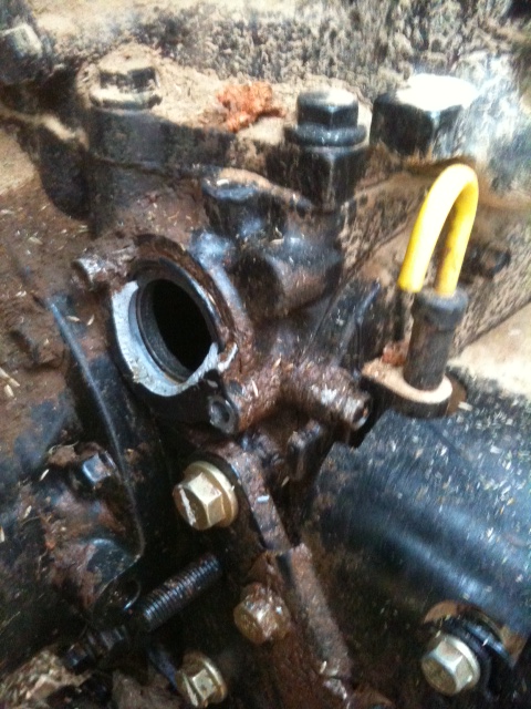 Thanks Don. In the third photo the aluminum foil is blocking the sheered part to prevent rain from getting in there. You can see it's towards the PTO area. I assume it's oil in there? I removed one bolt on the right side of the part, the other one I'll have to work on, the hex on the bolt is stripped somewhat. Here's some photos: