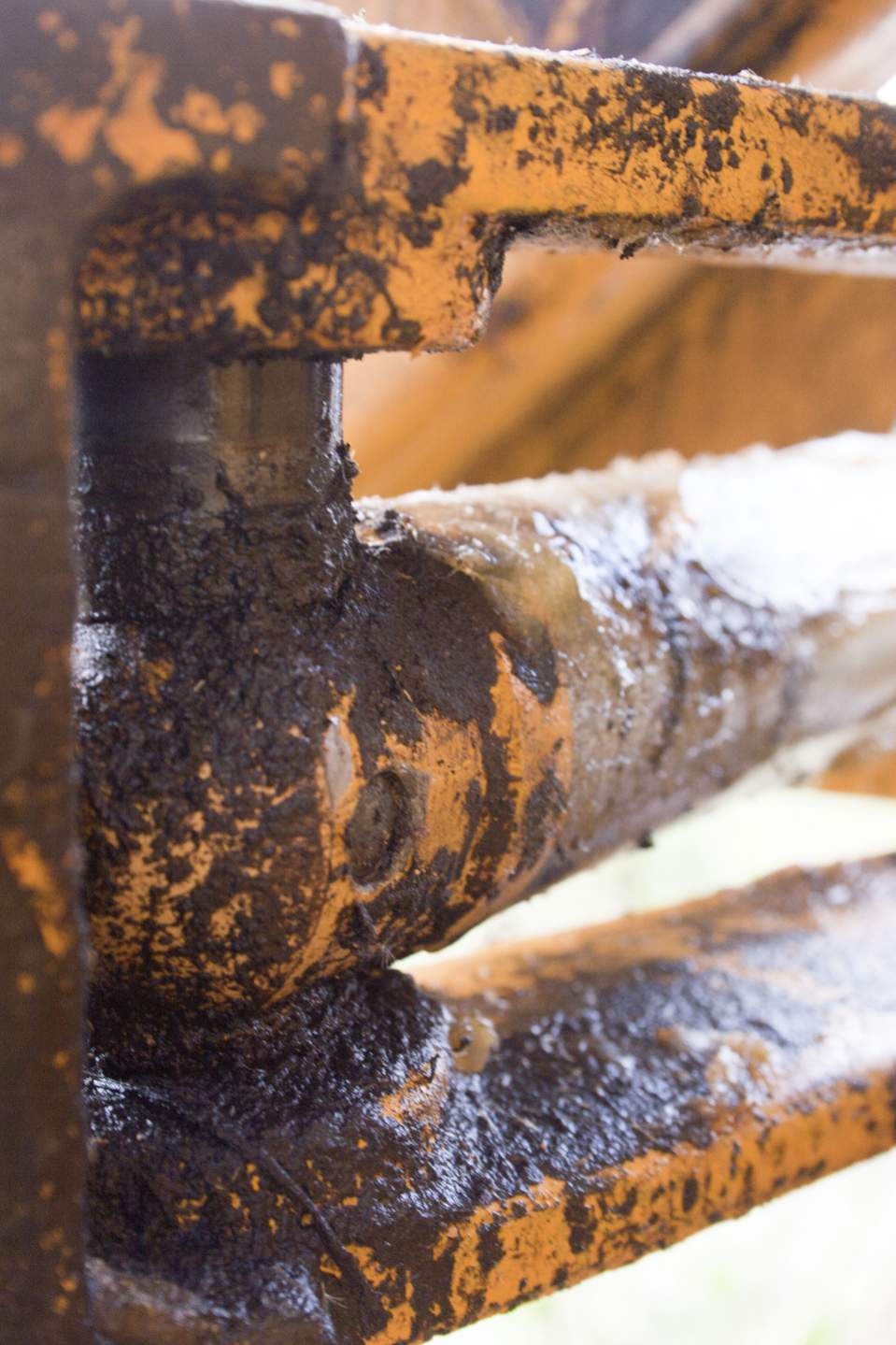 I have an old Long backhoe that I am trying to remove hydraulic units for rebuilding. I am having problems with two units where I am unable to remove the pin holding the unit to a hinge. The first photo shows the pin from the outside, the second from the reverse side. I can see nothing that is holding the pin, other than it possibly being a tapered pin. Any suggestions on how to remove this pin?