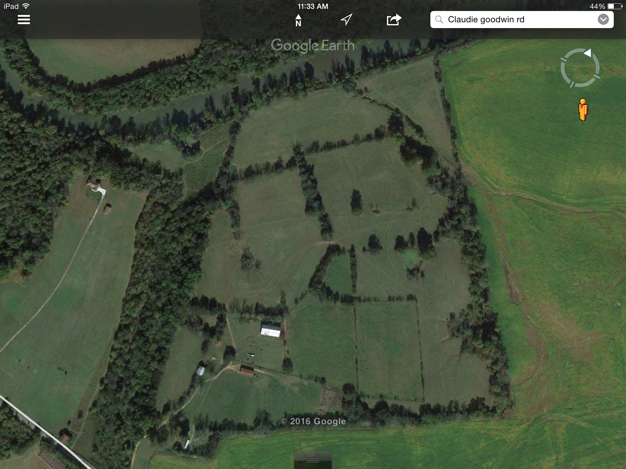 This is a Google Earth image of my field, and as you can see, there's a little ditch that follows a waterway in the top-right corner of the field and drains into the river. I would like to fix that. And don't worry, Im getting rid of the trees.