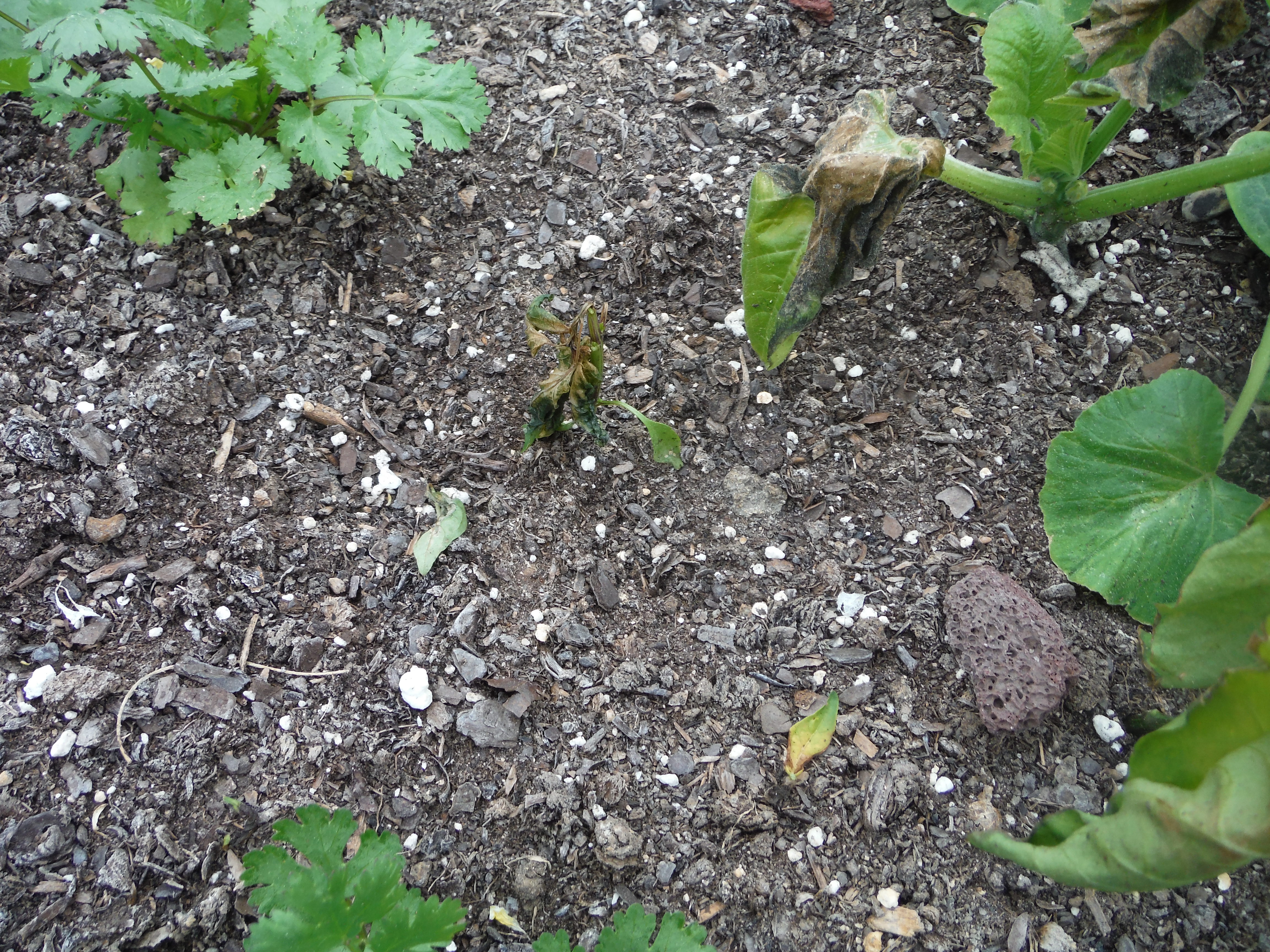 The only place I saw that was touched up pretty bad was the kiddie pool with the acorn squash and peppers. I had turned on the sprinkler for them, but I guess the broccoli {right beside the sprinkler} was so tall they didn't get washed off as good. Two or three pepper plants look like they might die, and the acorn squash will be slowed down at the very least. But most all the stuff planted in the ground looks good. A couple of green beans got burned, that was about it.