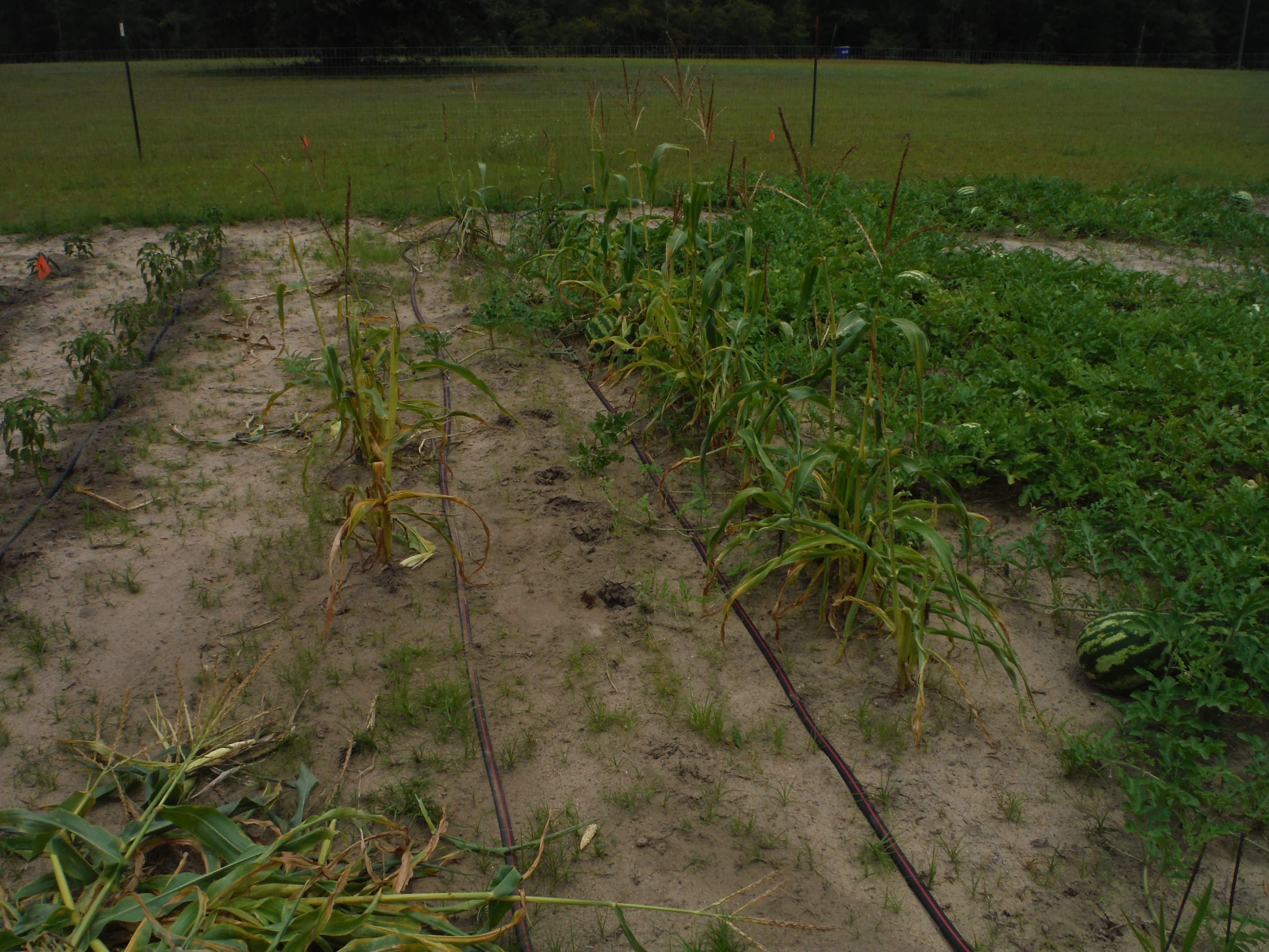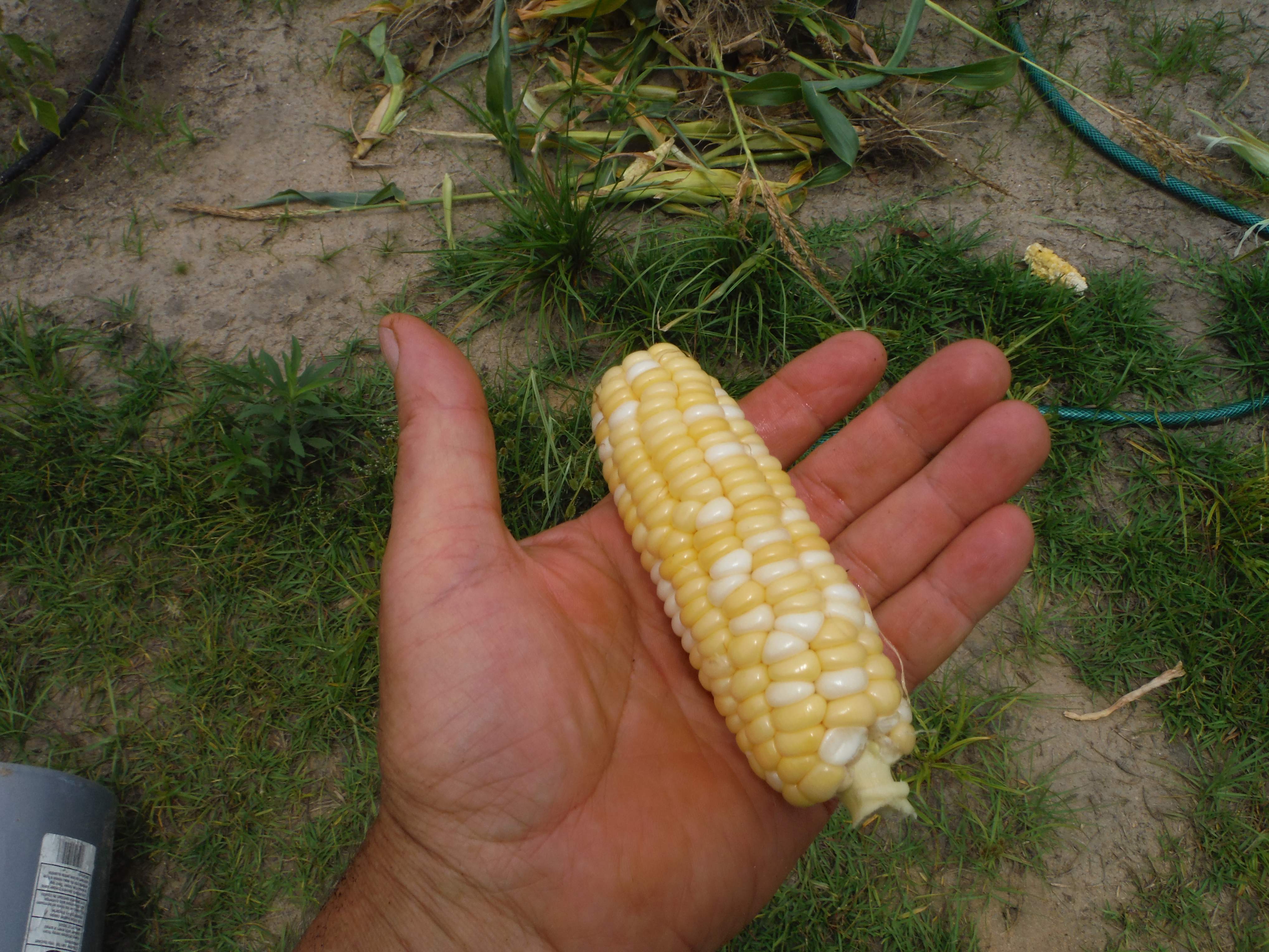 I've been taking up soaker hoses from where they are no longer needed and moving them to my young pepper, cucumbers and peas. I pulled up the stunted corn this morning, moved the melons back and took up that hose. I ate what corn there was left on the stalks right in the garden. The ear in the picture was about as big as there was left. And there were plenty that were smaller. We made cream corn to go in the freezer {and a small amount for supper} from 3 1/2 dozen ears off of the other corn. I have come to the conclusion that grocery stores don't charge enough for their veggies. The food on that plate should be at least $25 :eek: