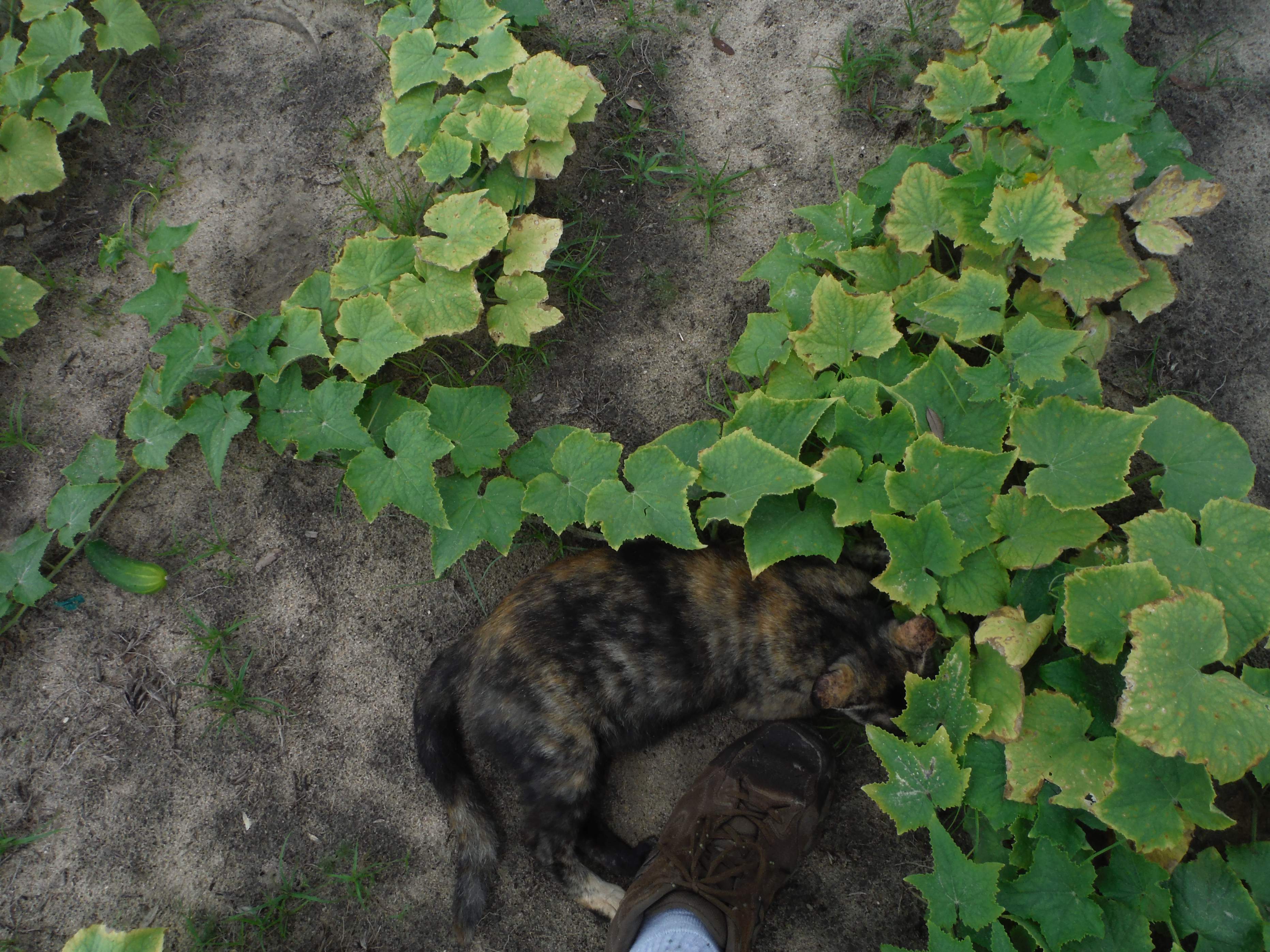 H*ll B@tch was helping me look for ripe cucumbers. I step on her at least once a day. It doesn't seem to bother her, as she is still always underfoot.