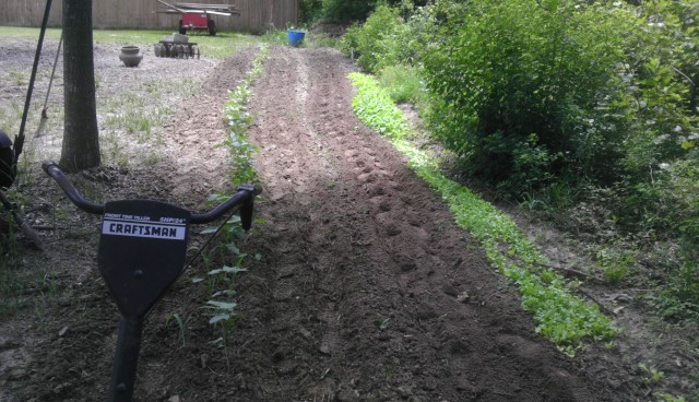 The choices in tomato plants were kind of thin at Walmart this morning. I went with Cherokee Purple and San Marzano. Both are heirloom, so I will save a few tomatoes in the freezer for seeds. I also planted 7 rows of Brown Crowder peas, 2 rows of green beans and a row of table queen, a dark acorn squash. And I'll add a picture just to show you guys that I do have a little color to my dirt. {if you dig deep enough} Larro