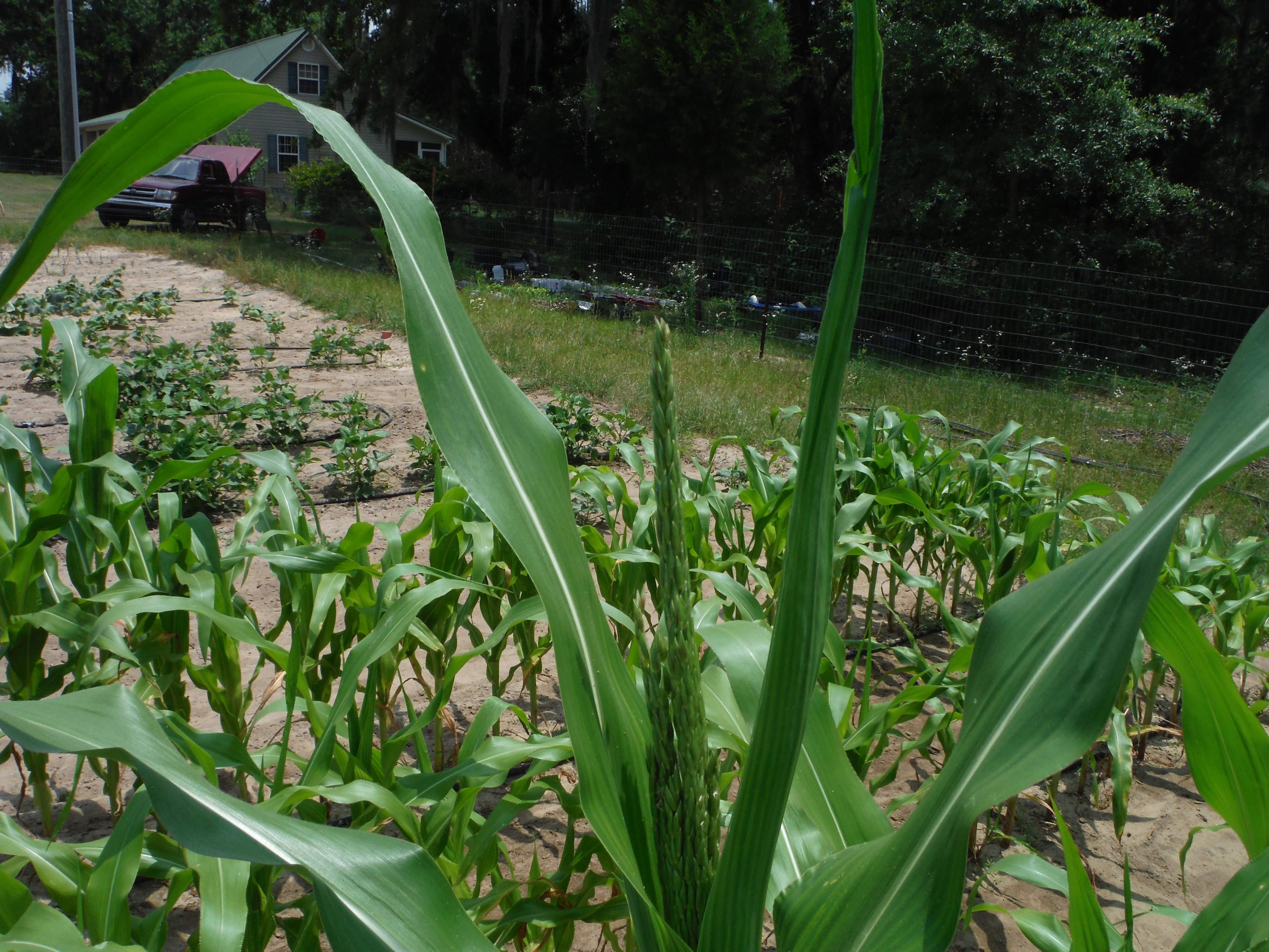 Then I went on to the garden and hoed and plowed until it was too dark to see. There was a bloom on the bell pepper. A small pepper on one of the Jalapenos. And blooms on the Crimson Sweets.