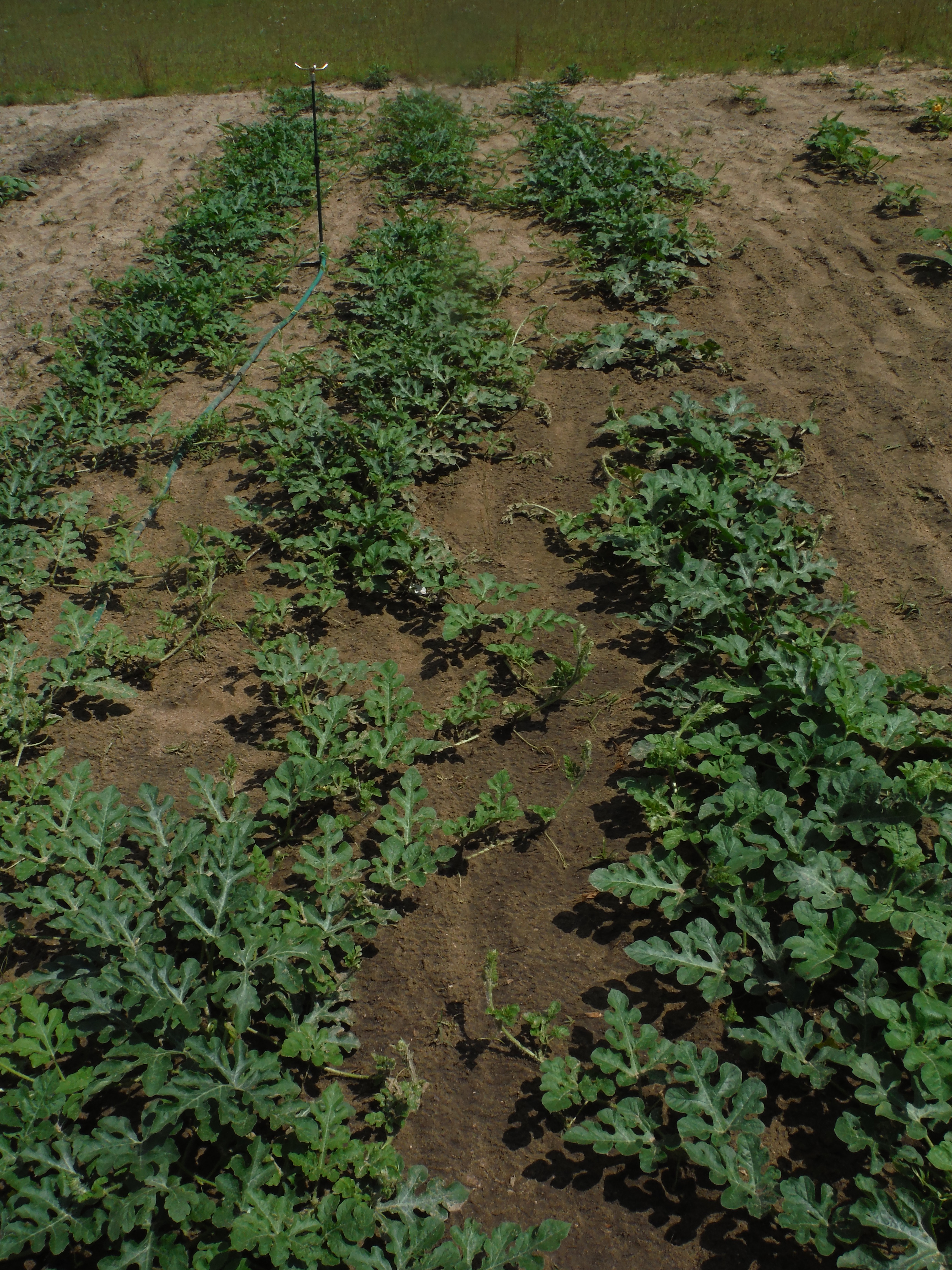 After I had put out about half of my 13-13-13/15-0-15/mushroom mulch/potting soil mix I realized that if I didn't go around the plant, but just put it down beside the row, I could cover most of it with the push plow.