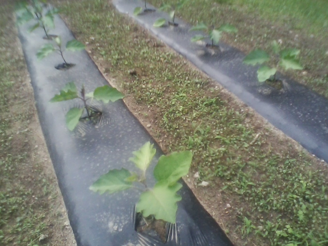Here's a shot of the garden from last year with no plastic down really does make a differnce here. Took a lot of hand weeding to around cleanup those eggplants. Just needing to walk my Troybuilt pony tiller between the rows of plastic soon. Ideally if I had the room my rows would be wide enough to use my JD4100 and 50" BH tiller in between