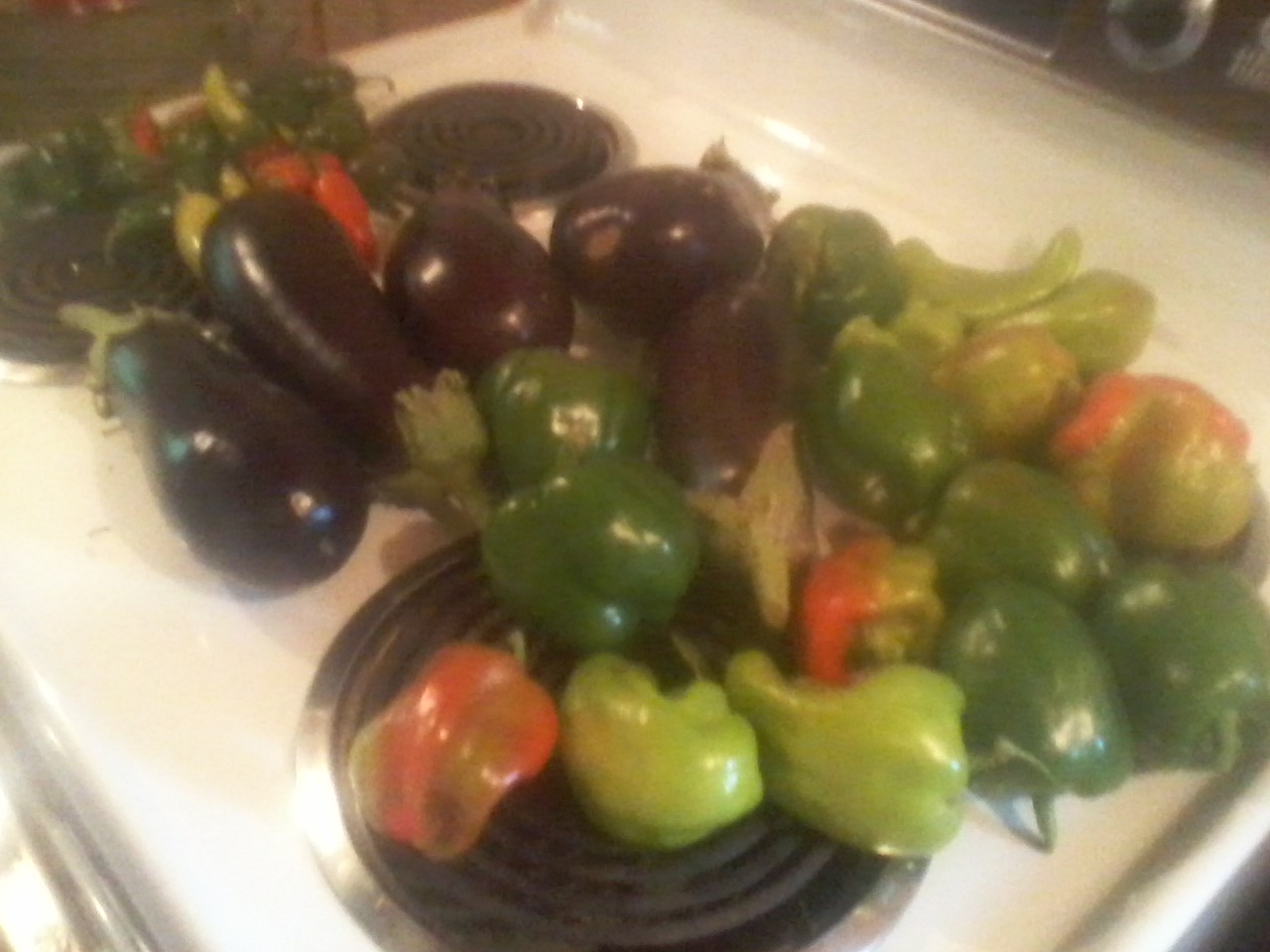 Scavenged the garden tonight after I got home from market. I really have just let it go being so dry even the weeds aren't growing much :laughing: So there's green bell and Cubanelle pepper, plus Hungarian hot wax, jalapeno, Italian cherry, and Harris Classic eggplant. Picked a few small tomatoes too. :D