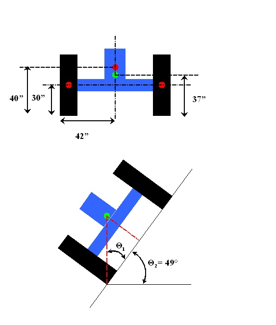 So, how far is too far? As Soundguy mentioned it totally depends on your set up, but the math is the same whatever you drive. For me, I did some quick estimates on my 6610. My tires are about 60" in diameter and with rims I estimate weigh 1,200 lbs each. The body of the tractor should be in the 6,000 range I think with a rough guess at center of gravity (COG) of about 40". So figuring out the moment of each wheel and the body, that gives an overall center of gravity of about 37". My newly narrowed wheel base is 84." With that, in a static condition, you can figure out how far is too far: The red dots are the approx COG of each wheel and the body. The green dot is approx COG for the whole thing. The compliment of the angle made between your COG, the edge of the wheel and your centerline is how far too far is...