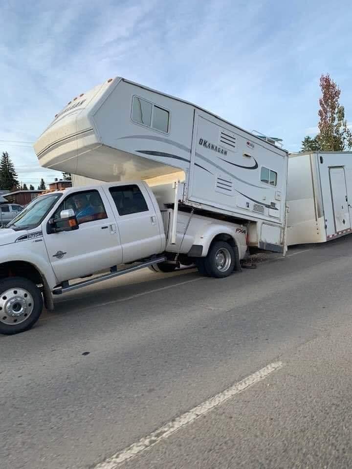 But I'm thinking this whole thing is a photoshop hoax. Obviously 2 different trucks but the camper and trailer appear to be the same. What are the odds the camper brand and the trailer with same stone shield would be the same? I say slim.