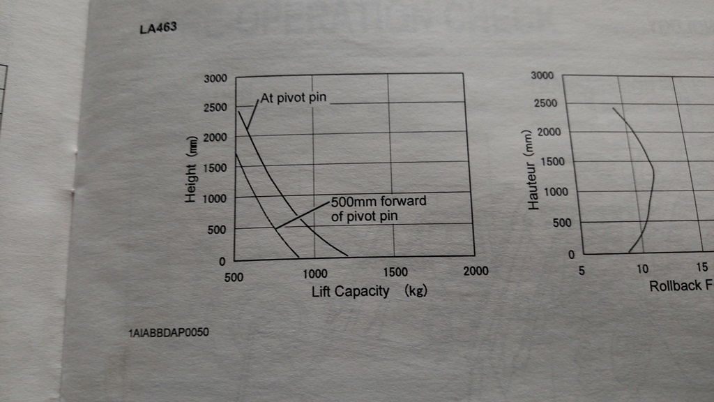 To a height of about 1000mm (40" truck bed height) it looks to still be good to ~650kg(1430lbs) at 500mm bucket edge and ~800kg (1720lbs) Not hard to see why I can lift a 1200# pallet with clamp on forks to load in the bed of a truck, especially with my relief set 300psi over spec. And able to lift some pretty good logs just high enough to be out of the dirt to cut.