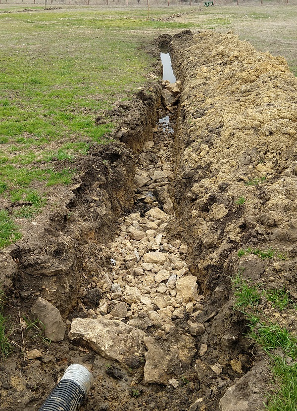 So, here are a few pictures I took a couple hours ago of my drainage trench - just in time for the next round of rain to show me how well I did for slope. A couple months back I had a little help from my son digging in the coop 'run'. The trench served multiple purposes, had to bury the machine cloth for protection vs. predators; laying the drain pipe; and the tetris-like stacking the stones Inna sorta filter like surround of the pipe.
