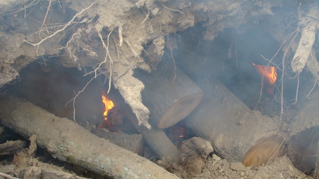 If you do have a tractor to work with all the better but even then don't get in a hurry and try to re-pile or push too hard you just want to push the burning stump and coals to the center on to the parts that are not burning as well most times just a slight bump is all that's needed to be effective. The main thing is to not push too hard because if you do you may push the stump on the other side over and out of the pile and when this happens you most times have to start all over. What you want to do is to keep working the fire into the center and as you do you will at a point have all three or four close enough to where they will be leaning inward and burn themselves up as they lean in on each other. When you get to this point you may see holes or spaces that are open in-between the stumps and it is helpful to stuff what wood you have laying around into these places to keep things going and at night when you are ready to go in for the night make sure you have some good sized pieces of wood cut you can lay on top of any open holes to keep the heat inside and in the morning you will probably find that at least two of the stumps are mostly gone and you then pull out the small easy to handle roots out and pile them on to what is left and start all over again. There is a lot of heat in the ground where the pile was and if you have a way to shake out what is left of last nights pile the that is great just bring in three or four new ones and arrange them the same way you did the others and start all over again using what is left to get the new pile going.