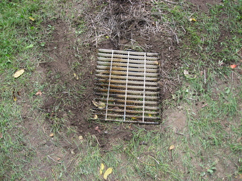 I personally would just cut the pipe flush and see what happens. I don't see it being a trip hazard as once its there people will get use to it and if they find themselves tripping over it often, well, don't ever let them drive. But if it does become a problem you can always adapt a grate after the fact. Mowing, just straddle over the opening and don't worry. I would be more worried about mowing over a steel grate and having it pop up under the deck destroying the blades, if the plastic pipe rises some how the mower won't even notice.