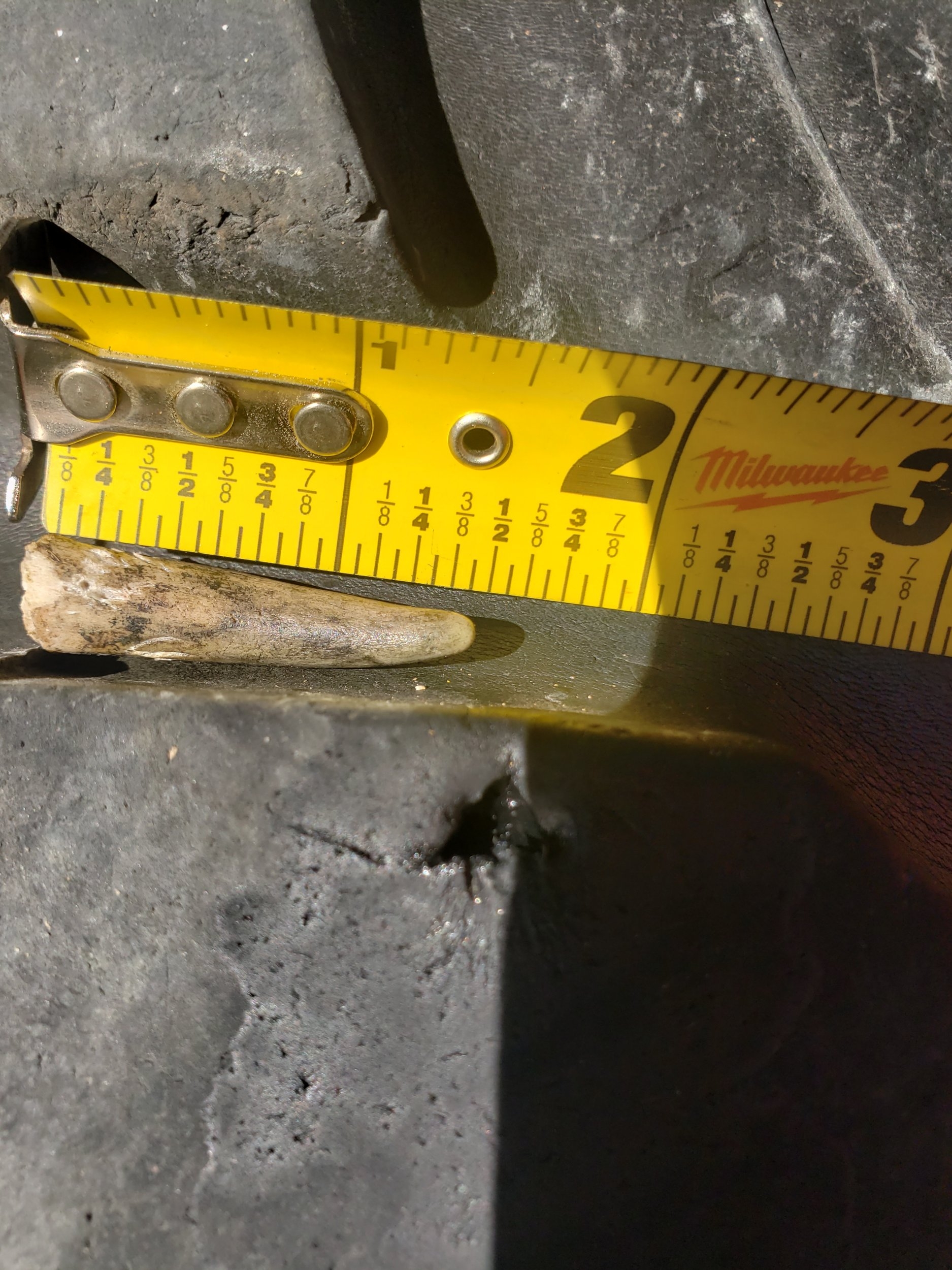 Hm, using two HF picks and removing it, it is a 1 1/4 long tooth, from right rear tire.