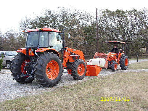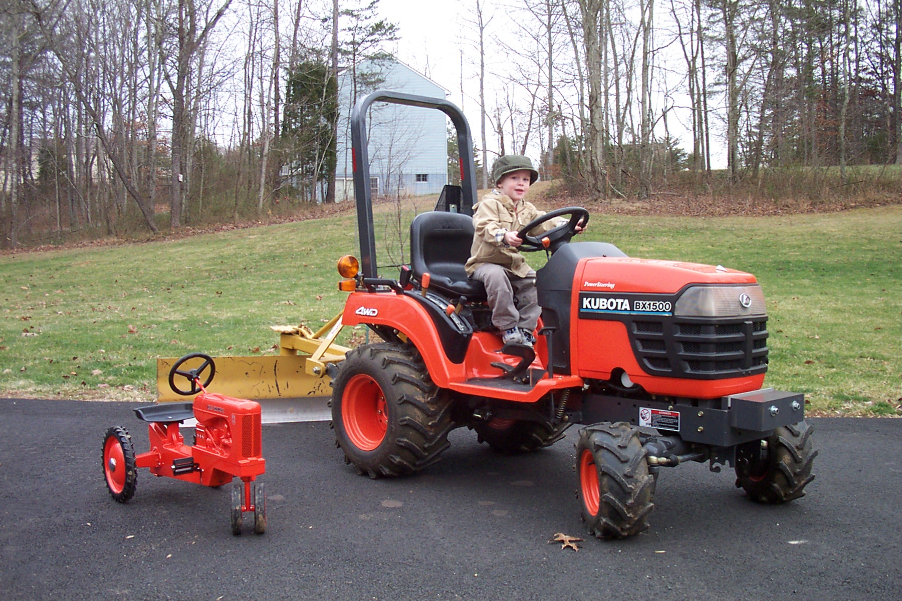Now, lets get some orange paint on that back blade to set a good example before that youngster goes attaching a green and yellow cart to that new tractor of his!