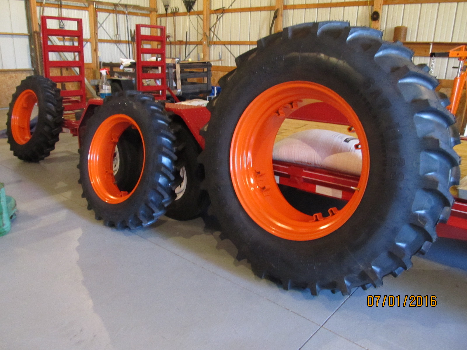 I ordered a set of Firestone SAT II 23 degree long bar/long bar tires because they are durable, quality and work great in dirt. Plus they look nice. I had the shop dismantle the tires so I could separate the wheels from the centers and paint things correctly (OEM ONLY). No paint on the bolts, because that would look obvious, I just sprayed those with oil. Most anything not painted gets sprayed with oil to stop rust and create a patina as things age. My stuff stays out of the weather.