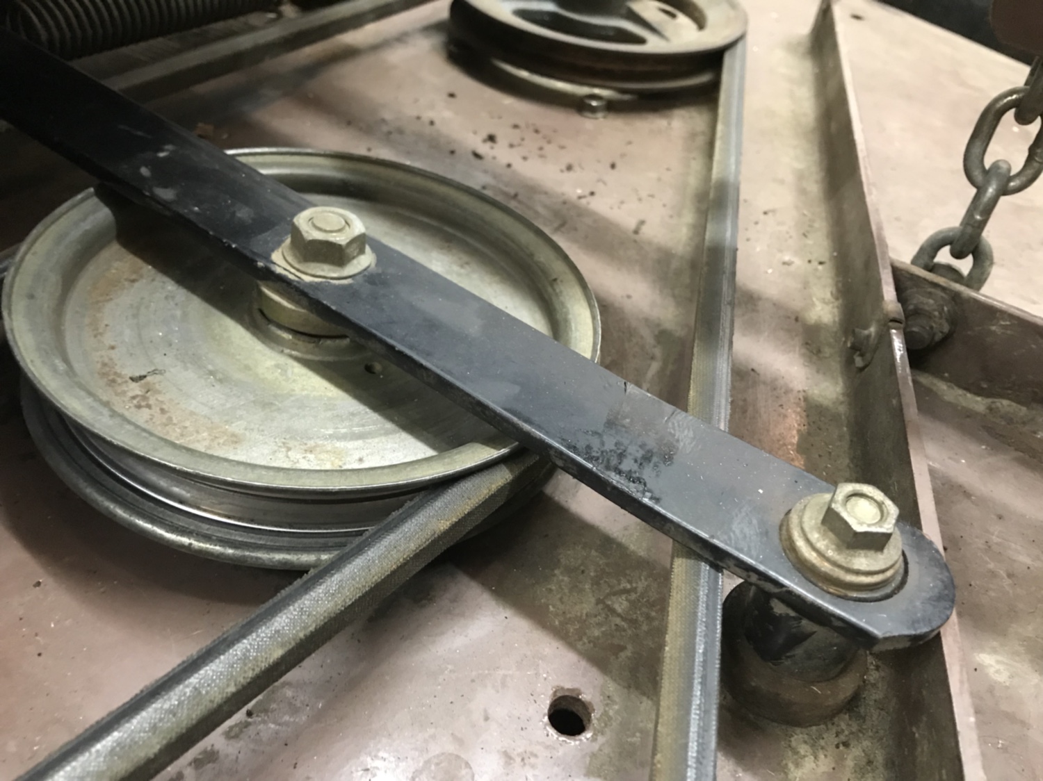 I replaced the center pulley on my mower with a double pulley and got rid of the stacked center pulley which reduced the clearance. Now the belts rub against each other. Even before swapping the pulley the belts rubbed against each other evident by the abnormal wear on the belt. I’m thinking some rollers to hold up the brown belt would help but the roller of such small diameter would be spinning at a smoking fast rpm and probably wouldn’t last long. Any other ideas? ATTACH]594984[/ATTACH]View attachment 594985View attachment 594986