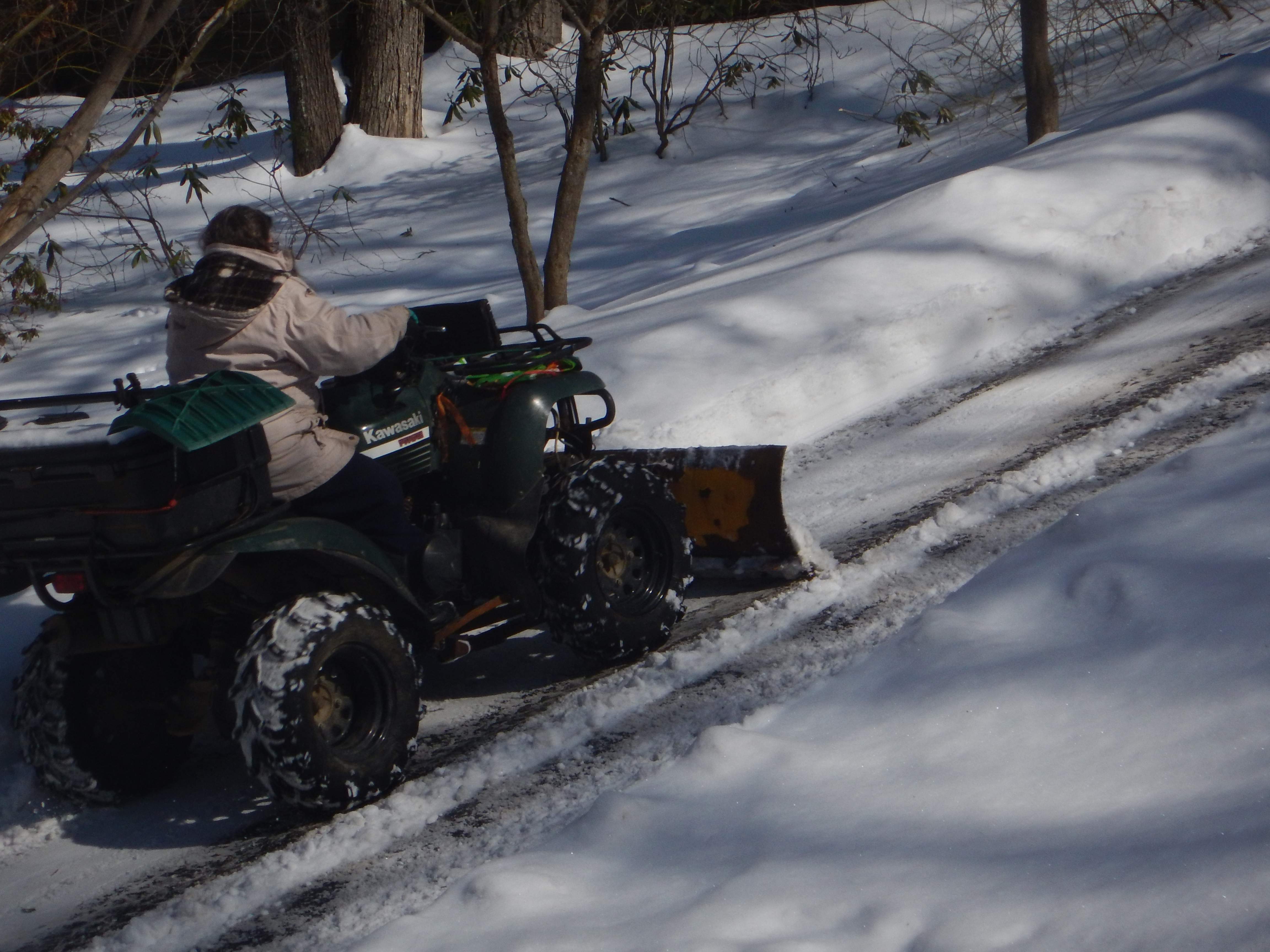 Re: Snow - I've been sick and confined indoors. SO we're leaving it. The kid next door did it for me one day and another the wife took the quad and plow to the driveway. When it gets warmer and I get healthier, I'll take the tractor and clean up and push back the snowbanks.