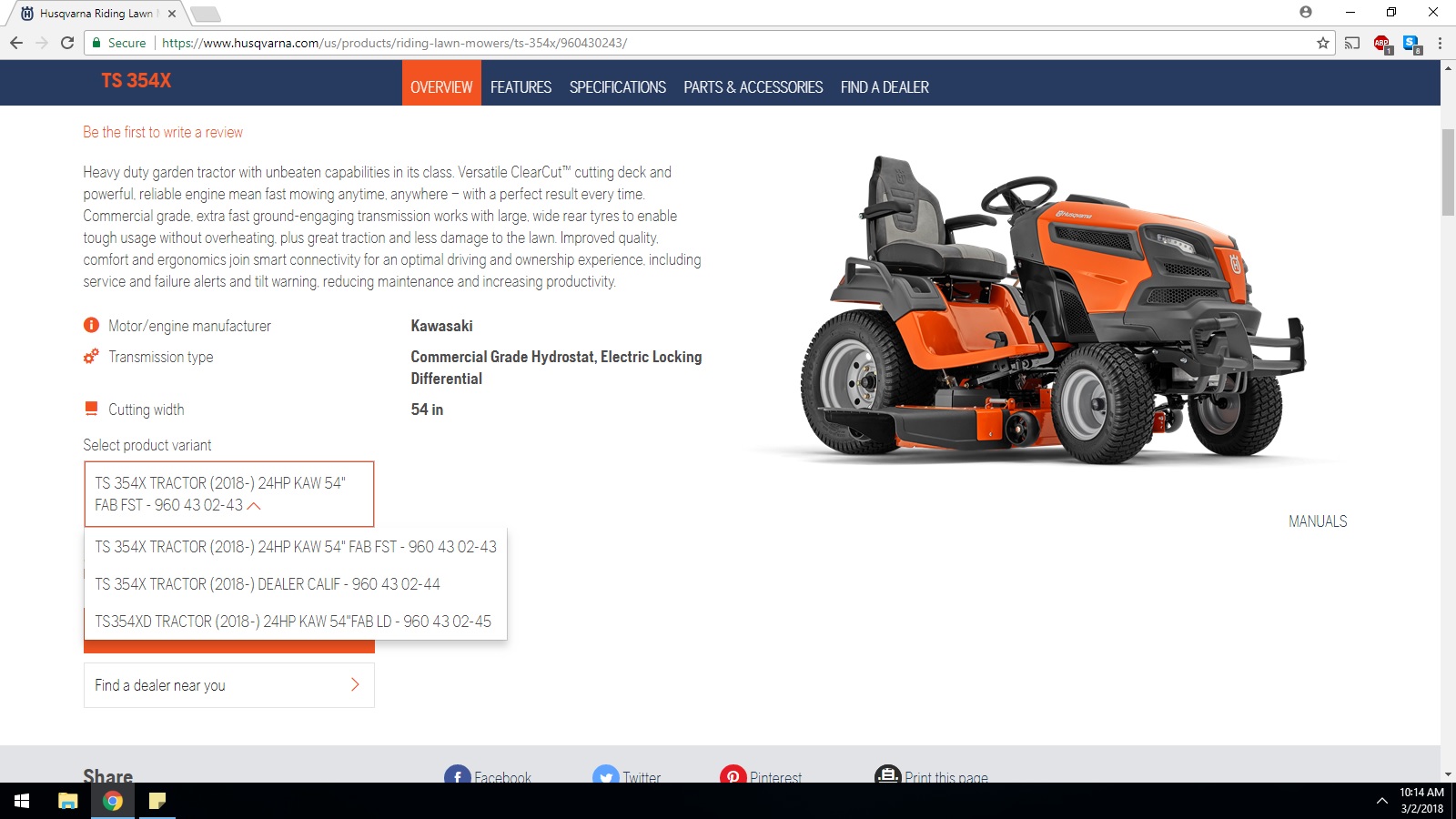 Their website has inconsistencies, however it says it has a Kawasaki engine. It also says it has a fast hydrostatic transmission, and in one areas it says it does not have a locking differential, and in another area it says it does - so who knows?
