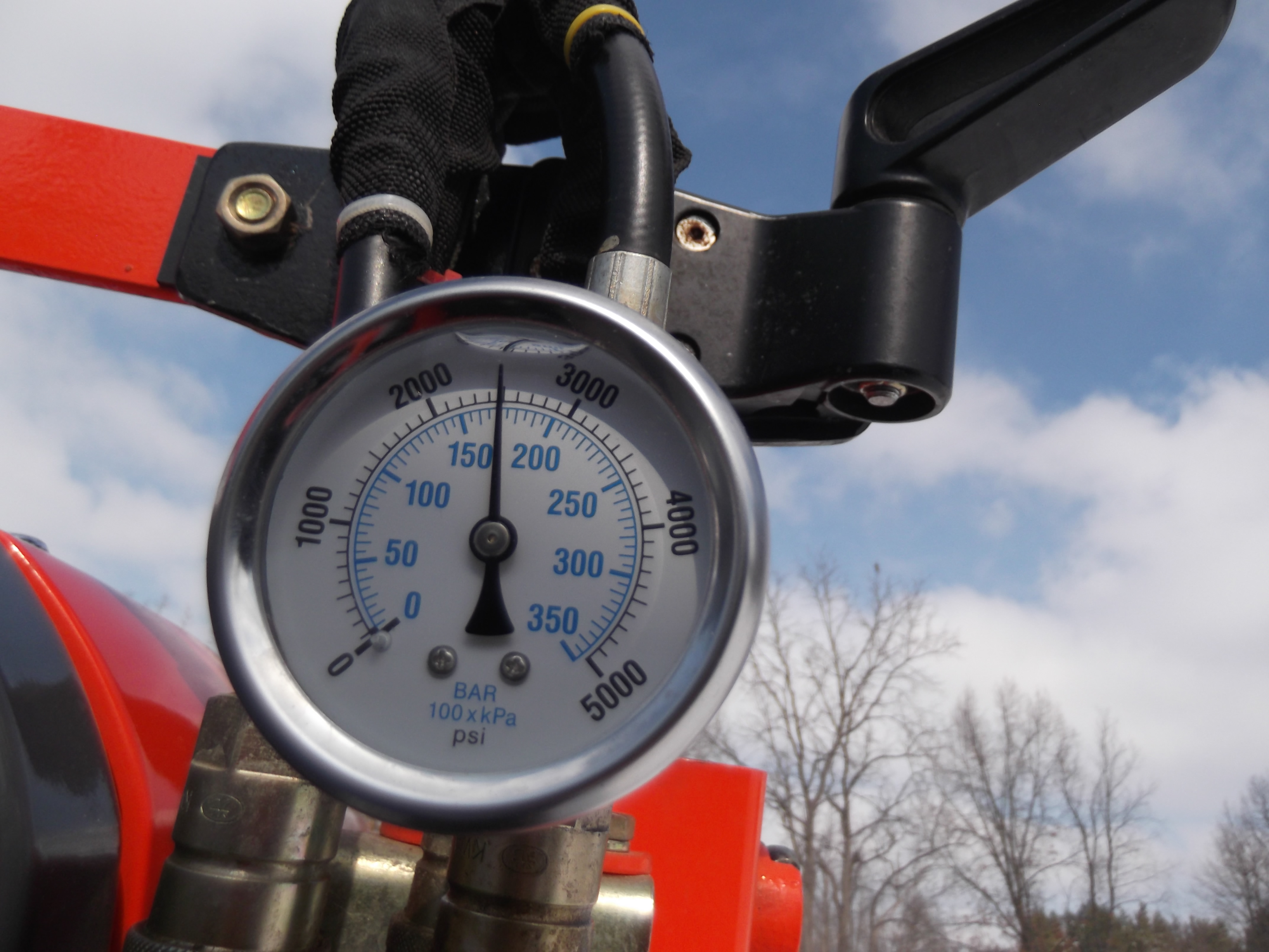 This is the gauge I put on my CK 30 .I thought about making it a removeable test piece = Why ? Piped it into the down hose , that way all I needed was a Hi- pressure 3/8" Tee the gauge and 2 bushings . Now by just going down with the bucket I can tell the pressure at any time . Looks like 2500psi . The bad news for me - I might have a cylinder leak past because with the bucket hhttps://www.tractorbynet.com/forums/images/attach/jpg.gifttps://www.tractorbynet.com/forums/images/attach/jpg.gif1/2 way up the gauge reads 900 - 1000psi ?
