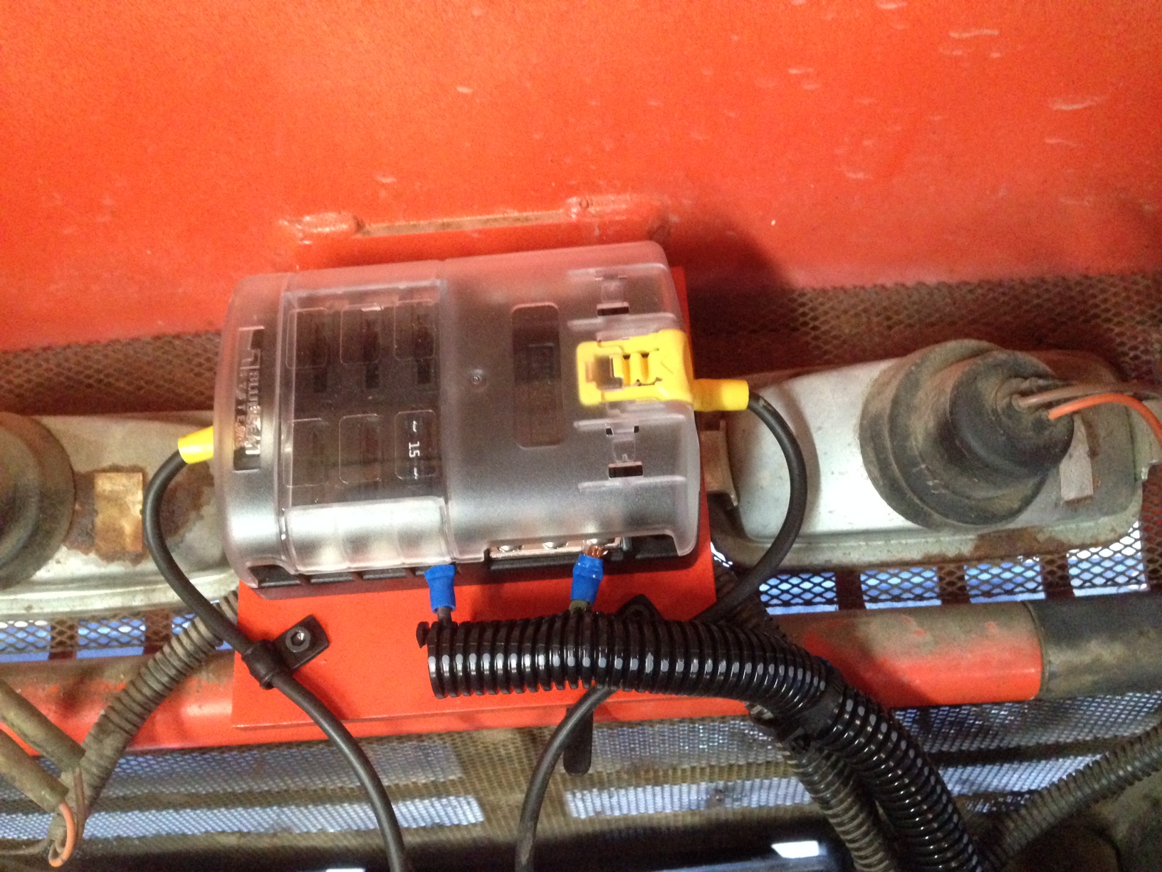 Photo 1 - Mounting plate for the aux fuse block attaches to the headlight bracket.
