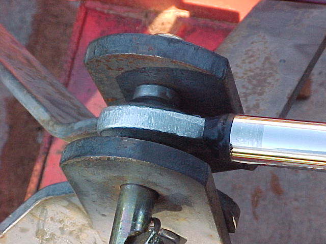 My OEM link collapsed to 18 1/2" and would extend 8" to 26 1/2". The Prince cylinder has 8" of extension and is 13 1/2" collapsed. That gave me 5" to make up by welding the swivels. To make things fit best, I didn't want to equally divide those inches. The swivel on the rod was cut quite short, while the rest of the length was made up on the cylinder base. This picture and the next one show what I mean. Rod end swivel, Picture #1.