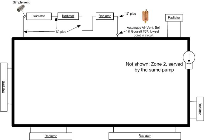 WF - is that bottom drawing correct? You have a main loop( heavy black line) with a circulating pump in the loop. Each of the radiators is a separate loop off that main loop? How does water flow out and thru each of the individual radiator loops?