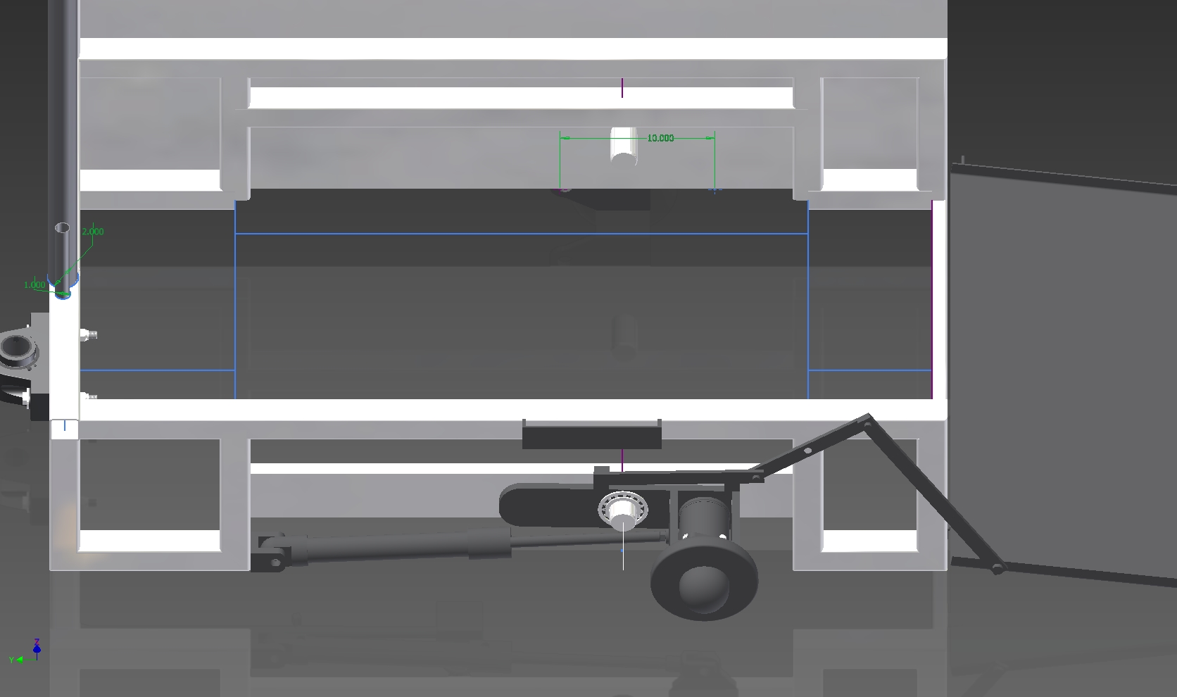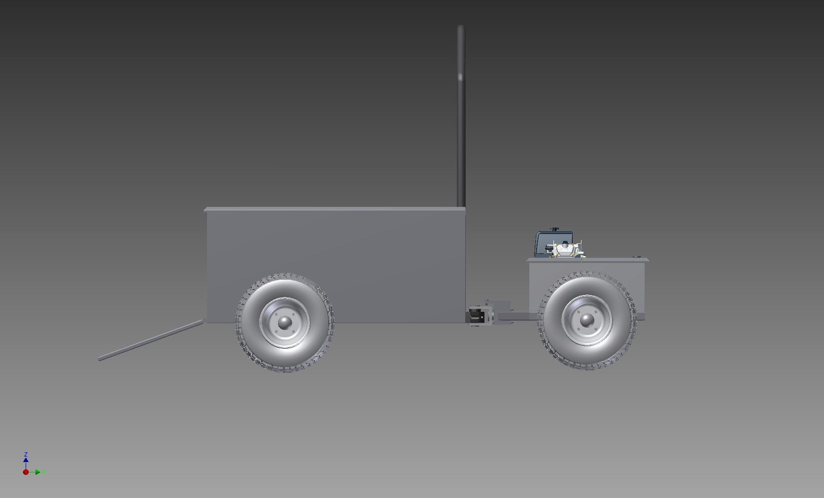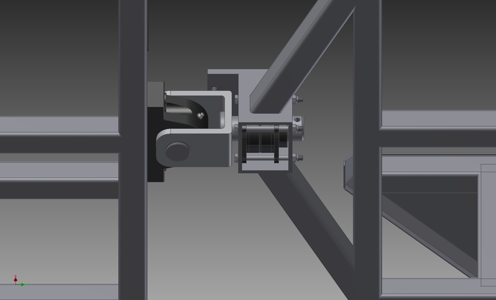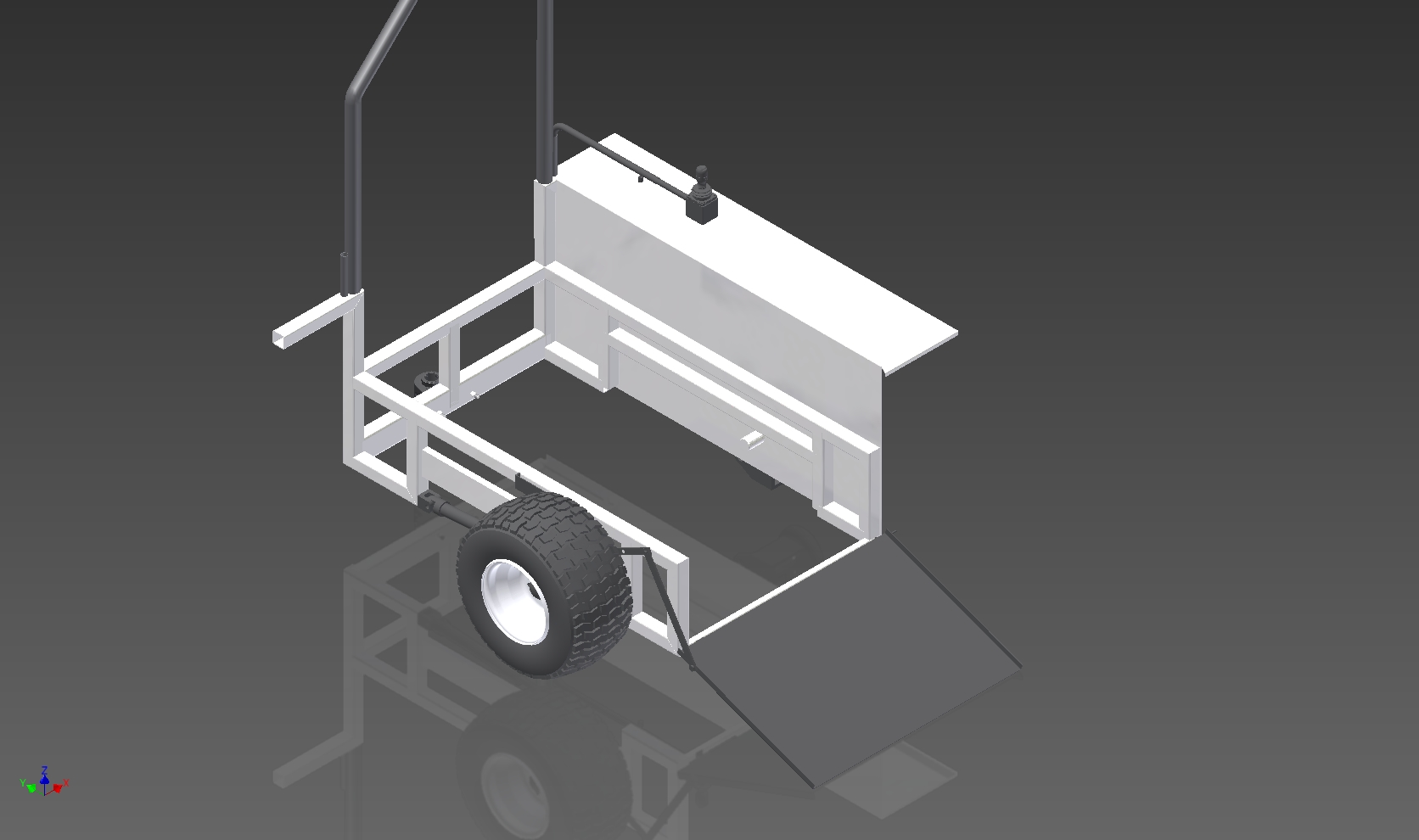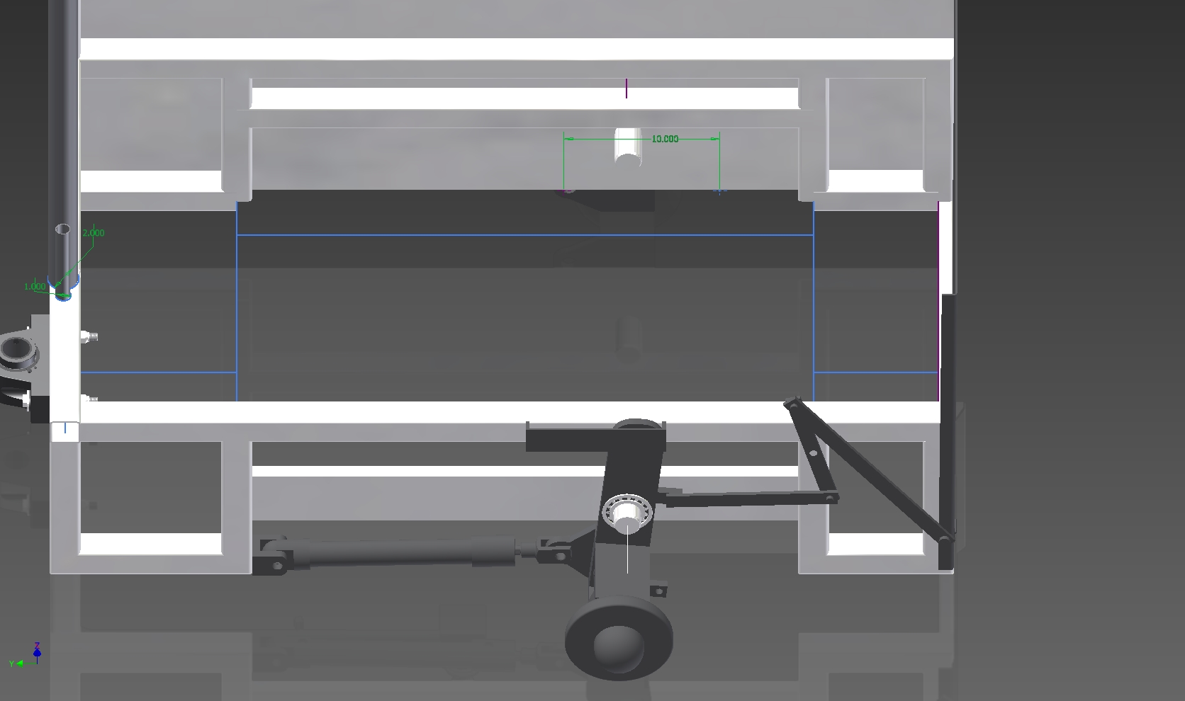 here is a blueprint of what I've been working on. The unique circumstance this machine s that it can't have a front axle, because the front-end needs to be able to lower down. The machine is for a wheelchair user. I've got a close-up of the articulating joint, I'm not quite finished yet, I need to add something so that it can only rotate a certain amount. It goes left and right and allows the joint to rotate in the center.