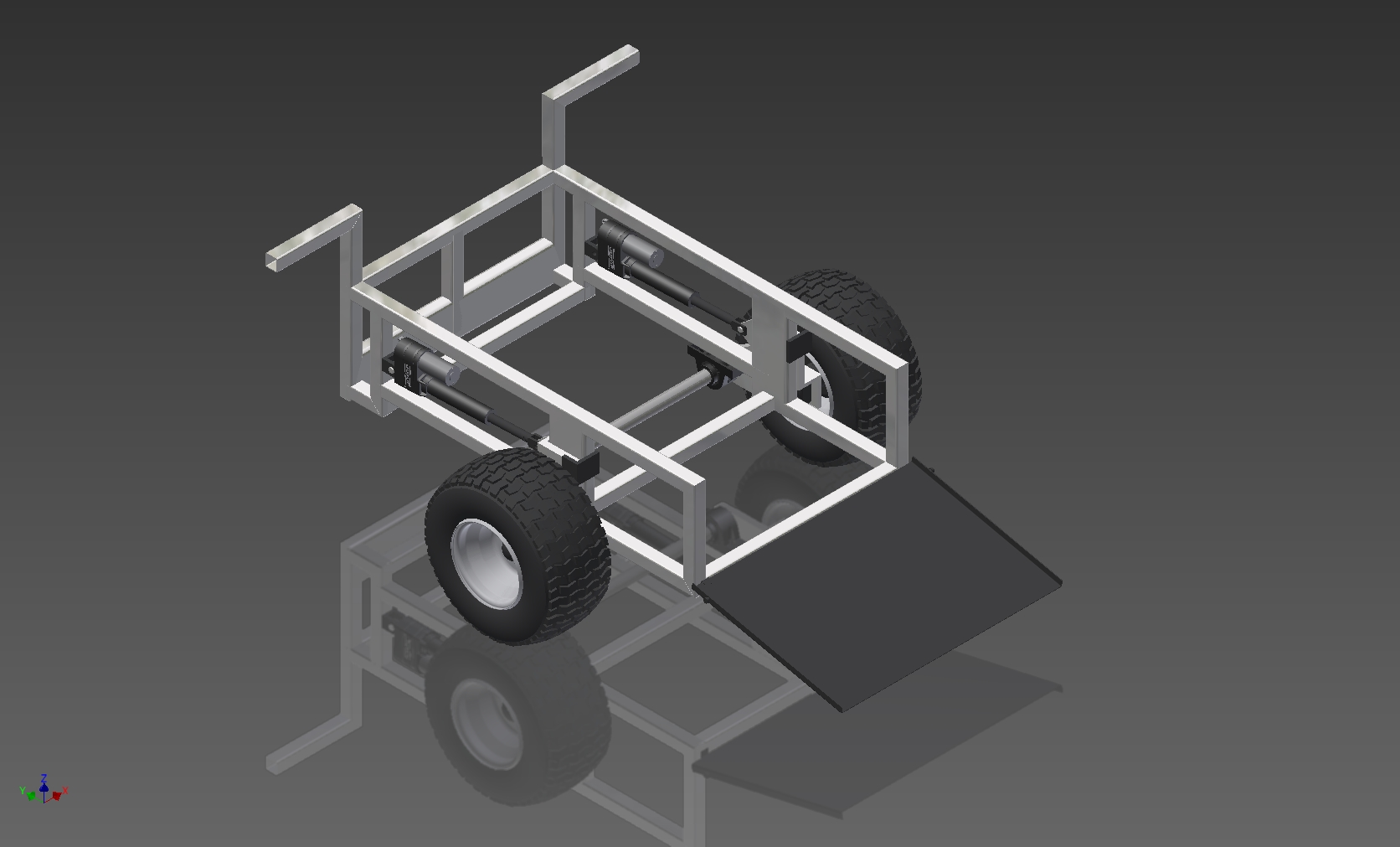 My concern with the false/hinged floor is from the top the main frame looks like a large "C" and needs something at the front to latch securely to minimize racking laterally. How about an "R" (closest letter I could find) frame where the floor pivot is in the middle? This would give you two solid crossmenber points instead of one with the "C" configuration. Granted the slope for your chair will be steeper; but the fold up ramp could be designed with an angle to act as a transition from the chair deck to the ground.