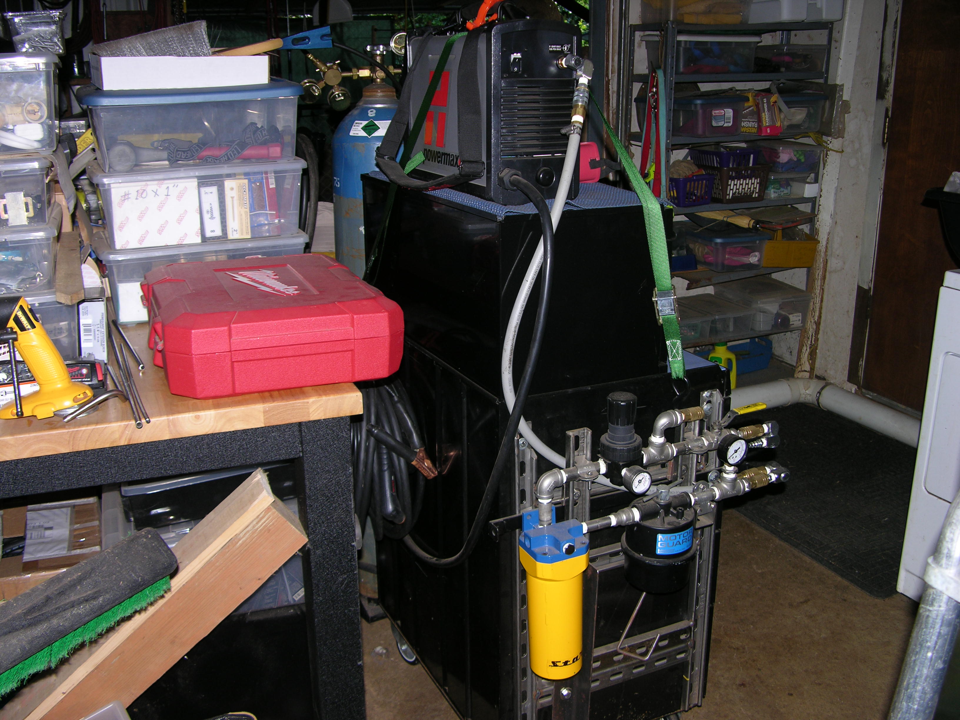 Back to plasma; my PM45 needs to be "sorta" portable, so it sits on a rollaway tool cabinet (which doubles as consumable storage for MIG, TIG and Plasma) - my compressor is the SMALLEST industrial one the local compressor store sells (5 horse Baldor, 80 gallon, inter-cooled, pressure lubed all cast iron, 21 CFM @ 175 psi) - so for "portability" I put together a "helper" separator