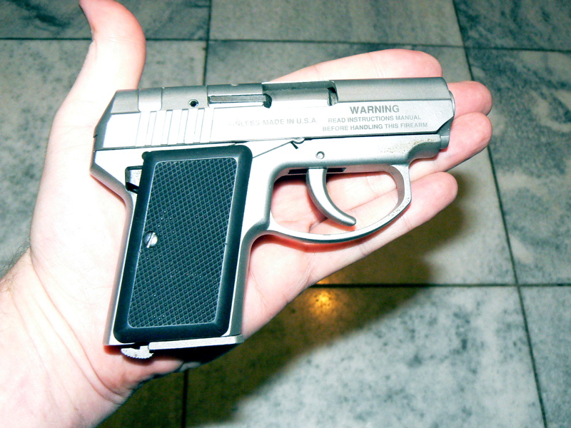 Below are photos of my AMT DAO "Back Up" pistol. The Kahr pistol is not much bigger than this. A small revolver like a Ruger SP101 is also not much bigger but can handle up to a .357 magnum round. Several years ago when I bought this gun the current breed of small 9mm polymer guns were only dreams in gun designer's minds.