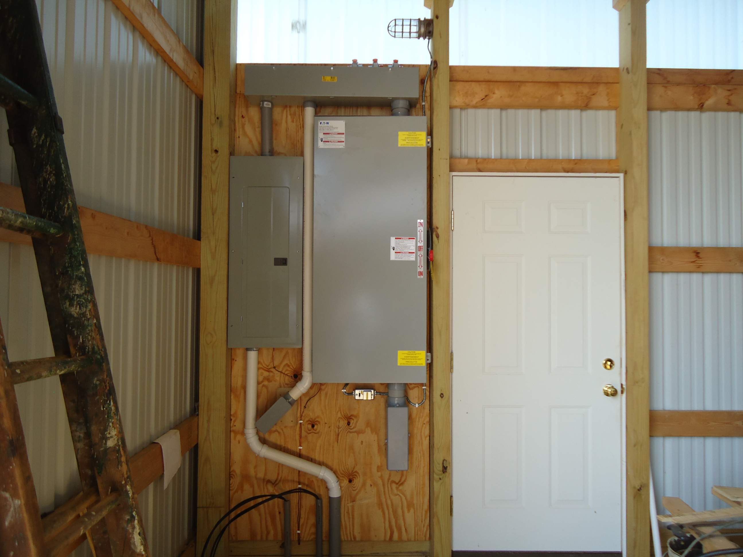 As for the electric.... I am setting up a 320 amp service, and wanted to have a hookup for the generator. There was some misunderstanding between the rep from the electric company, and the electrician. They said I needed a double disconnect, to get away from the utility power, when running the genny. Problem is, the key phrase there should have been "double throw disconnect". So I ended up with two breaker type disconnects on the outside of the building. That would not fly with the power company... Needed the box on the right to do the job. So..., the funky routing of the conduit connects what I already had on the outside, and makes the connections to the inside. And eliminated the one breaker disconnect on the outside.