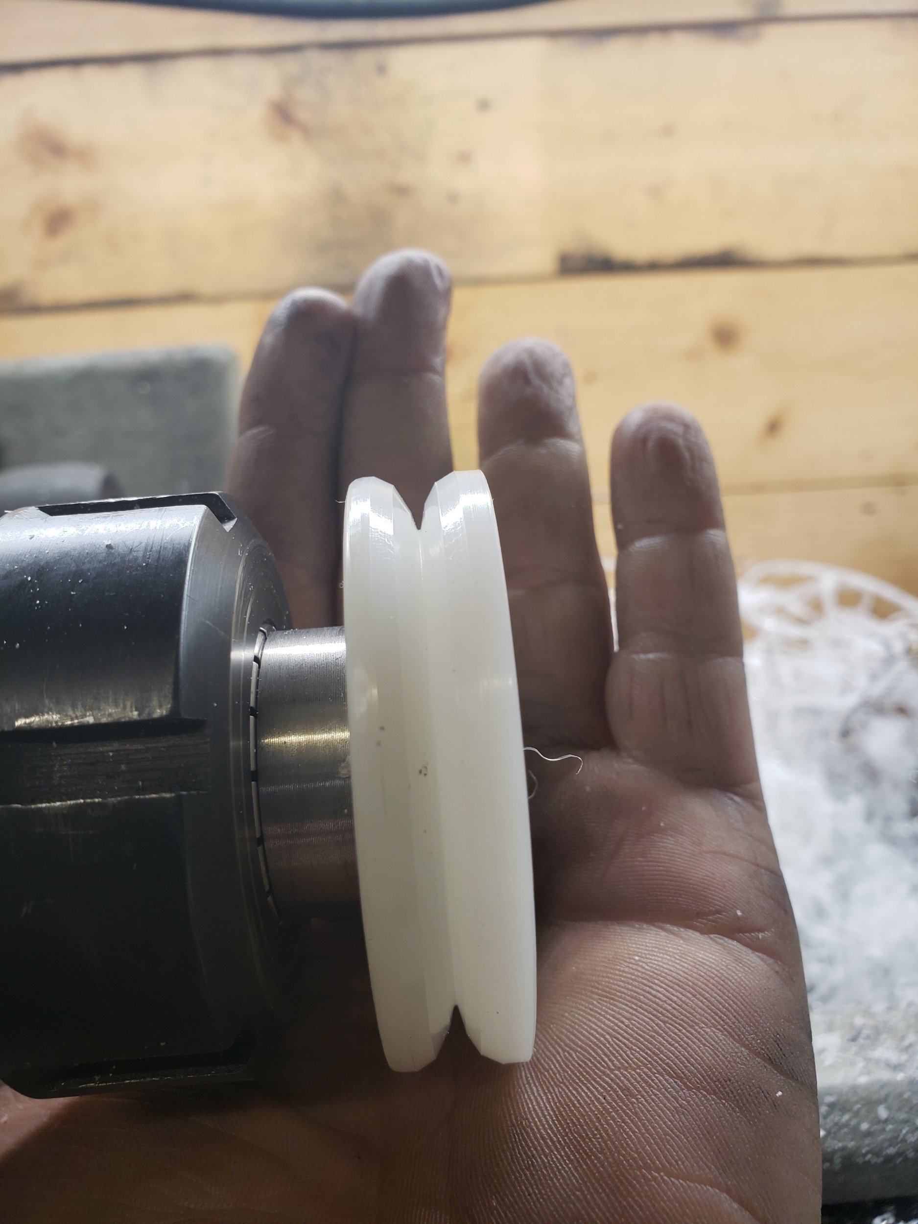 It's abrasive cutting so requires relative motion (slippage) to cut. Same reason your tires aren't (immediately) cut through by the abrasive highway, my pulleys aren't (immediately) cut through by the wire. Start doing burnouts though, and that goes out the window. There's no relative motion between the pulley and wire, I made sure of it. I made these pulleys out of UHMW (cut/abrasion resistant plasic - same thing cutting boards are made of) and machined them to a specific profile such that the wire is drawn down deep into the pulley and pinched from two sides for maximum traction.