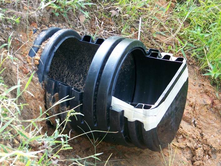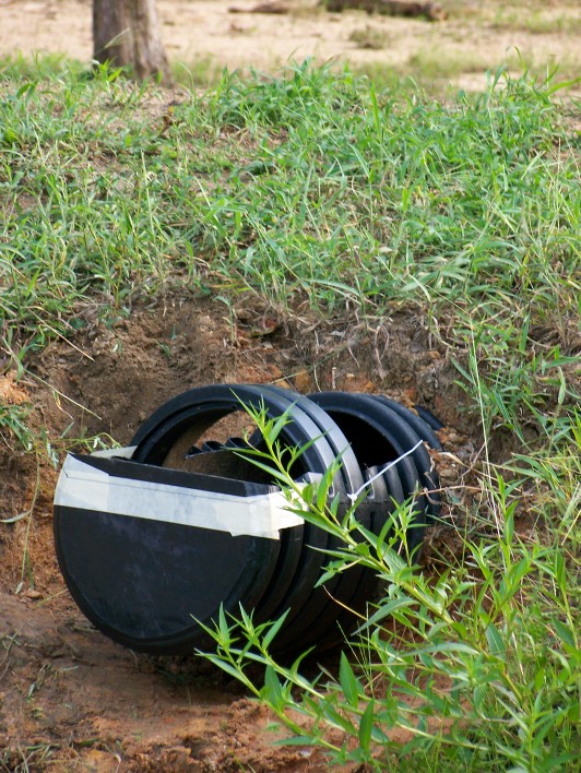 Look close and you will see a coupling around the end cap and pipe. It has flatter corrigation then the pipe and end cap. That and the ty raps should be enough to hold it in position. I have been against putting any type of screws in it, but I can if needed as it is a double wall pipe. The flat end of the cap is about 5/16th inch thick. The rest is thin plastic. But maybe I can drive some steel stakes in the dam down good and secure them to the flat thickness of the end cap. Thanks for the idea.:D I haven't thought about the force of water trying to push the whole thing up. I have throught about cementing around the end of the pipe.