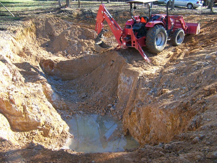 You can dig out with your loader bucket. I dug down to about 4 feet, but the small size of the pond and the depth I wanted dictated using a backhoe. If I had the room, I could have dug out the pond only with the 7 foot wide bucket. This was really faster digging then digging with the backhoe, then hauling out the spoils with the loader bucket.