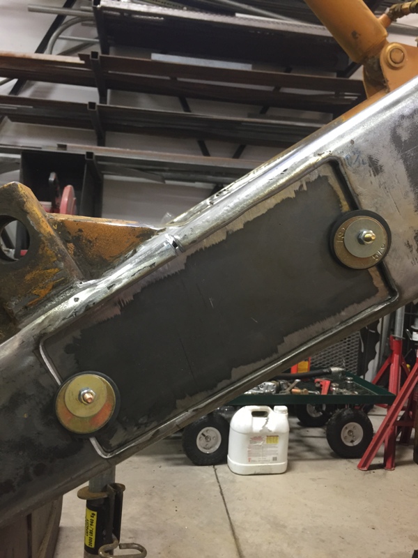 Then, I had my CNC plasma cutter make me a piece of 1/4" plate that was a bit bigger than the hole I had just made. By welding some bolts to that piece and using nuts and washers, I was able to draw it up tight to the inside of the loader arm for welding-