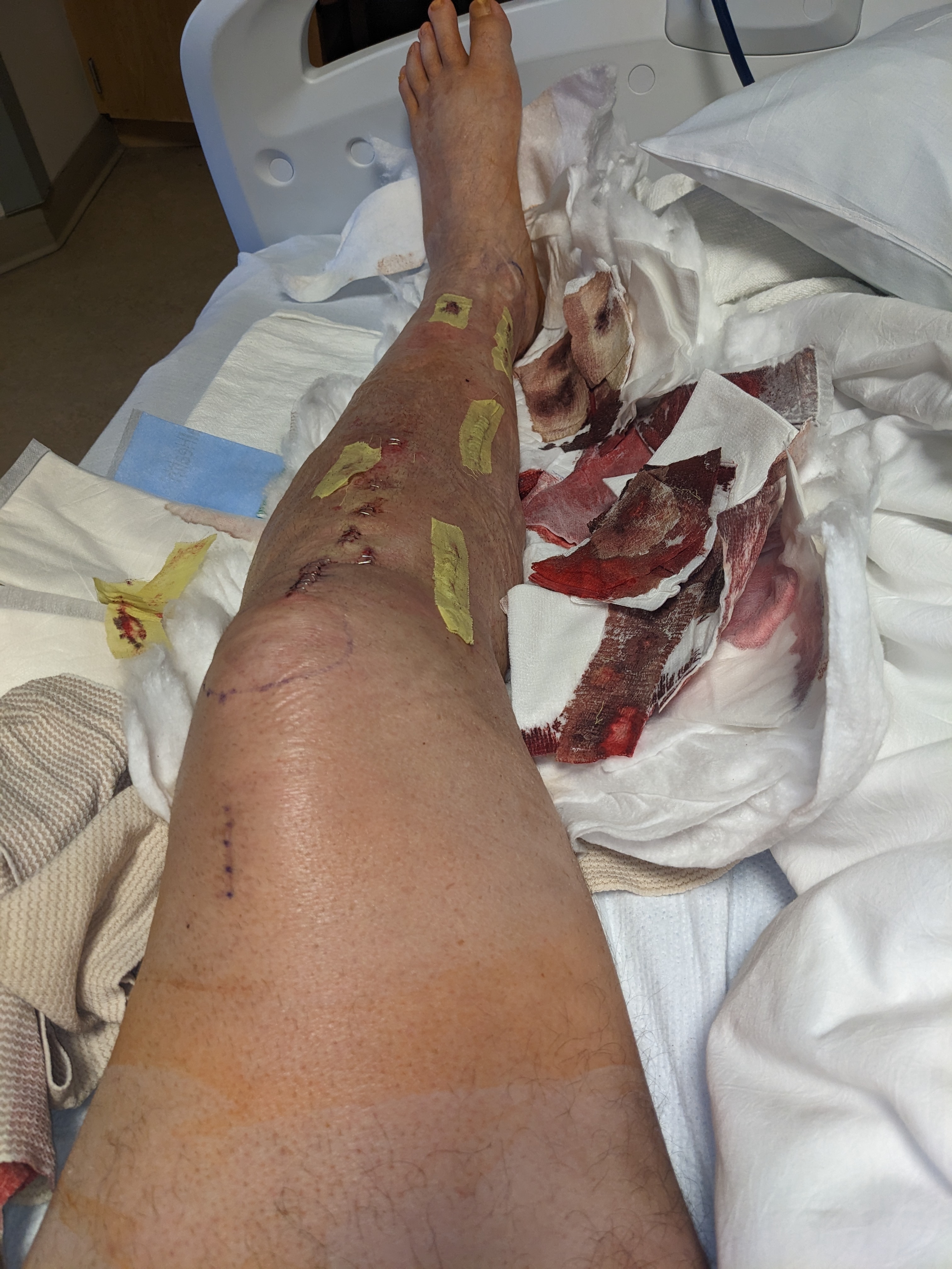 My platoon of guardian angels prevented my knee and ankle from being destroyed, thus the surgical team was able to install at least a 1/2 pound of titanium to reconstruct what was left of my calf, as there was enough bone left to attach the titanium bones to the joints. I have nerve damage.