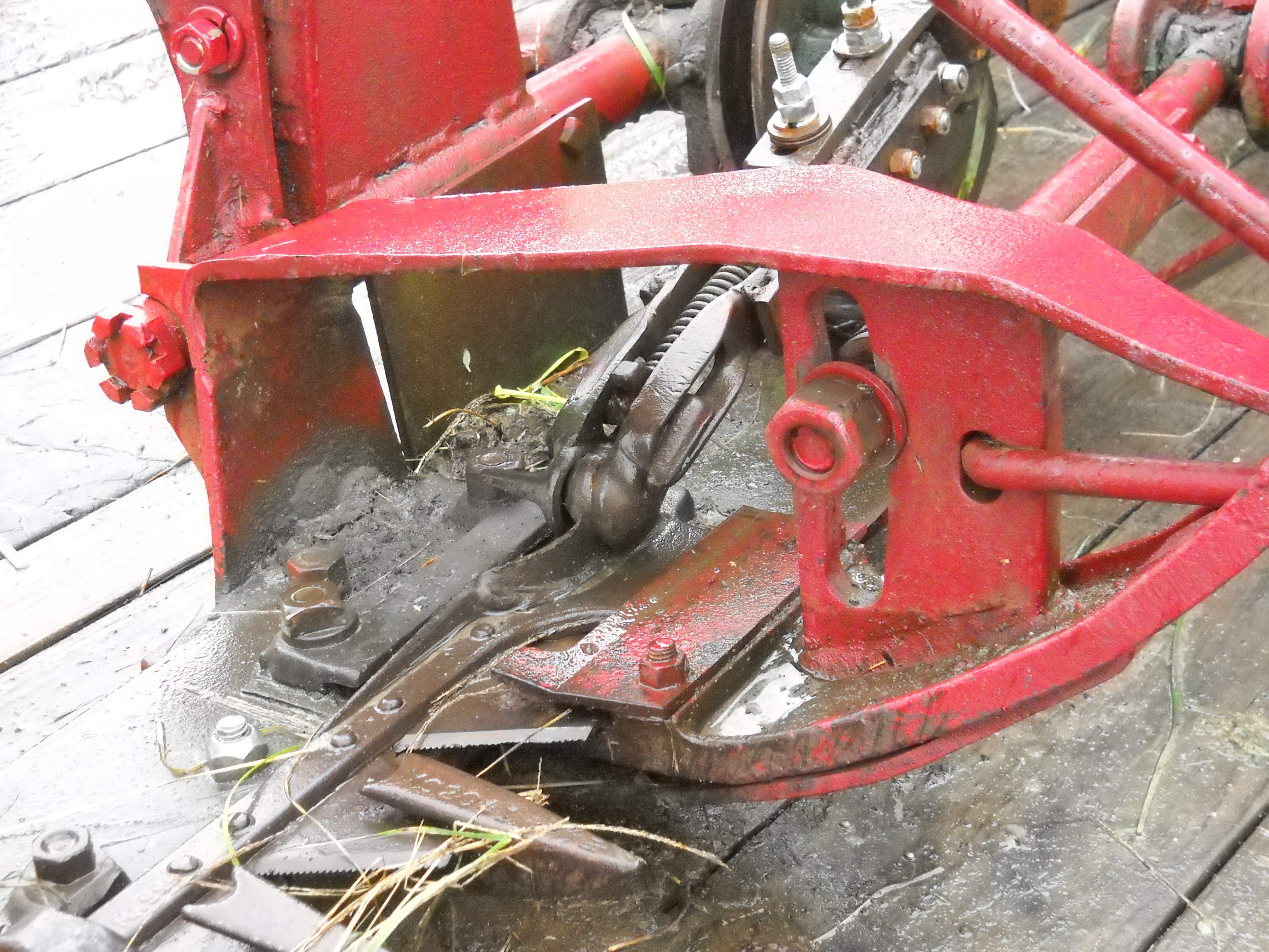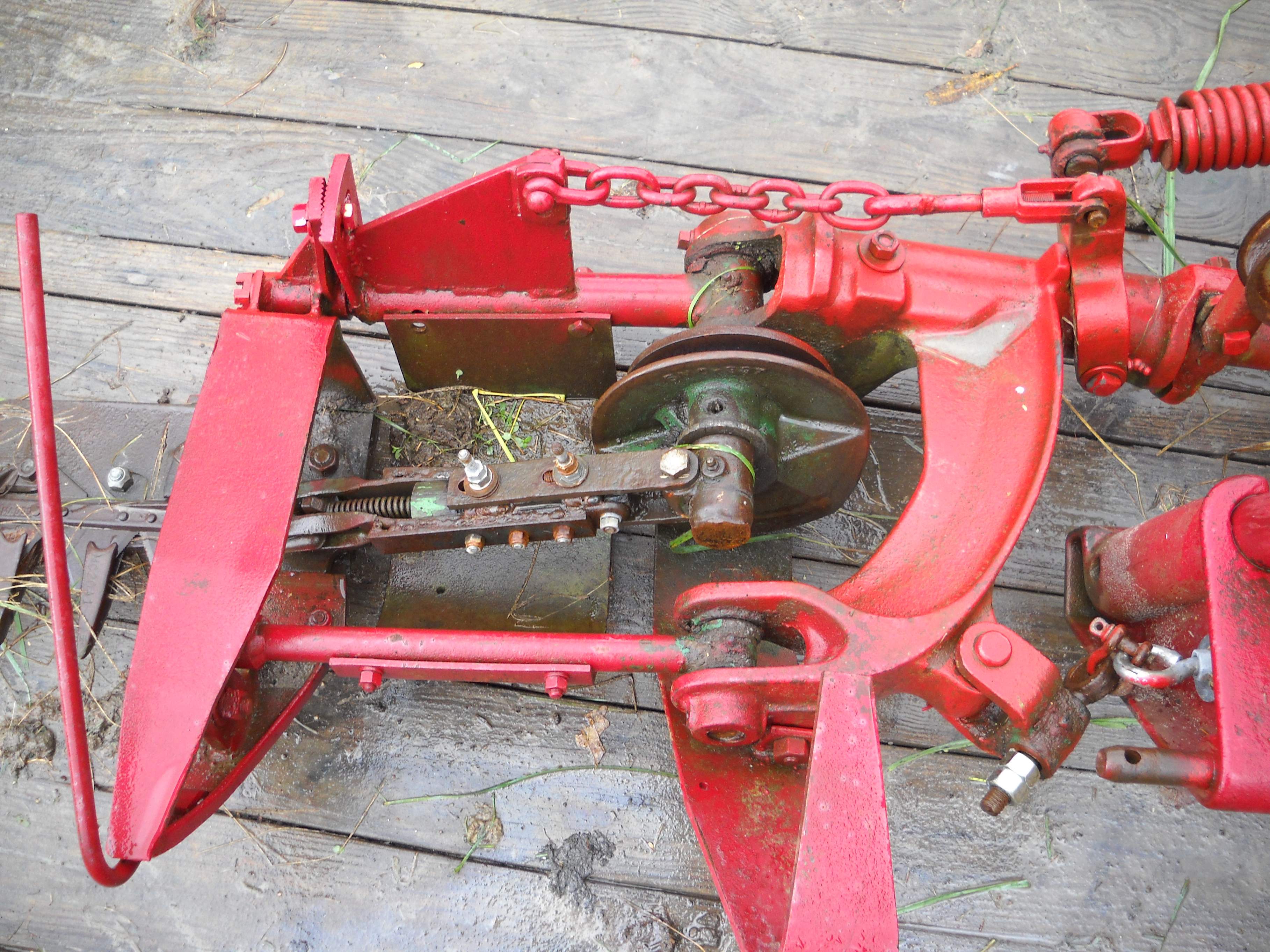 I am thinking it is a John Deere, to the right of the chain to the yoke there is an additional hole were another chain would connect and then travel across to the far pulley on the right of the PTO pulley and then travel down to the lower pulley and forwards and possibly up to the tractor so that when the unit is lifted up--it will pull on the chain causing the sickle to raise up.