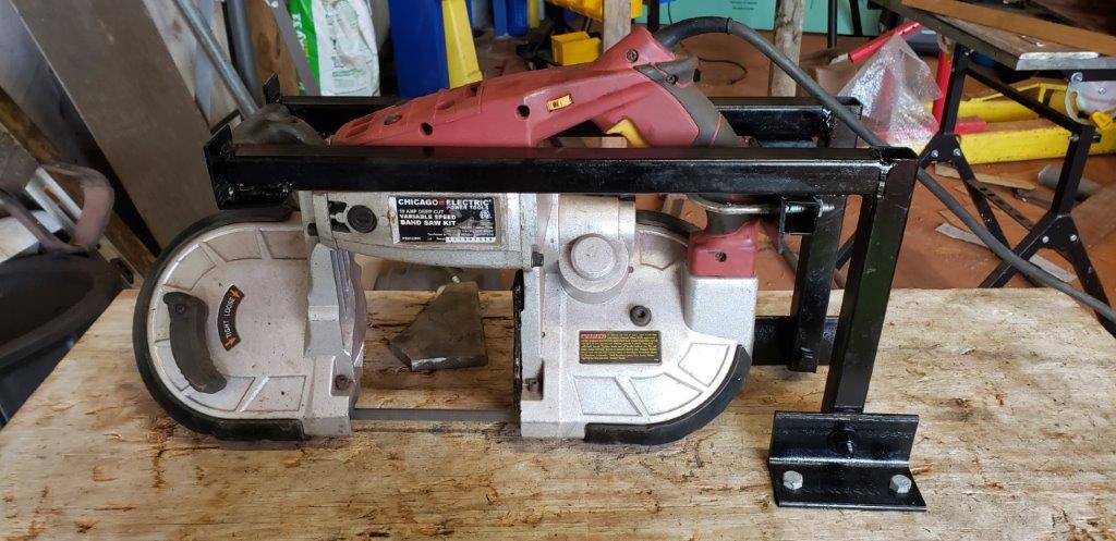 I needed to be able to cut steel straight. I made a hand band saw stand. It will allow me to use it like a chop saw or vertical standing saw.